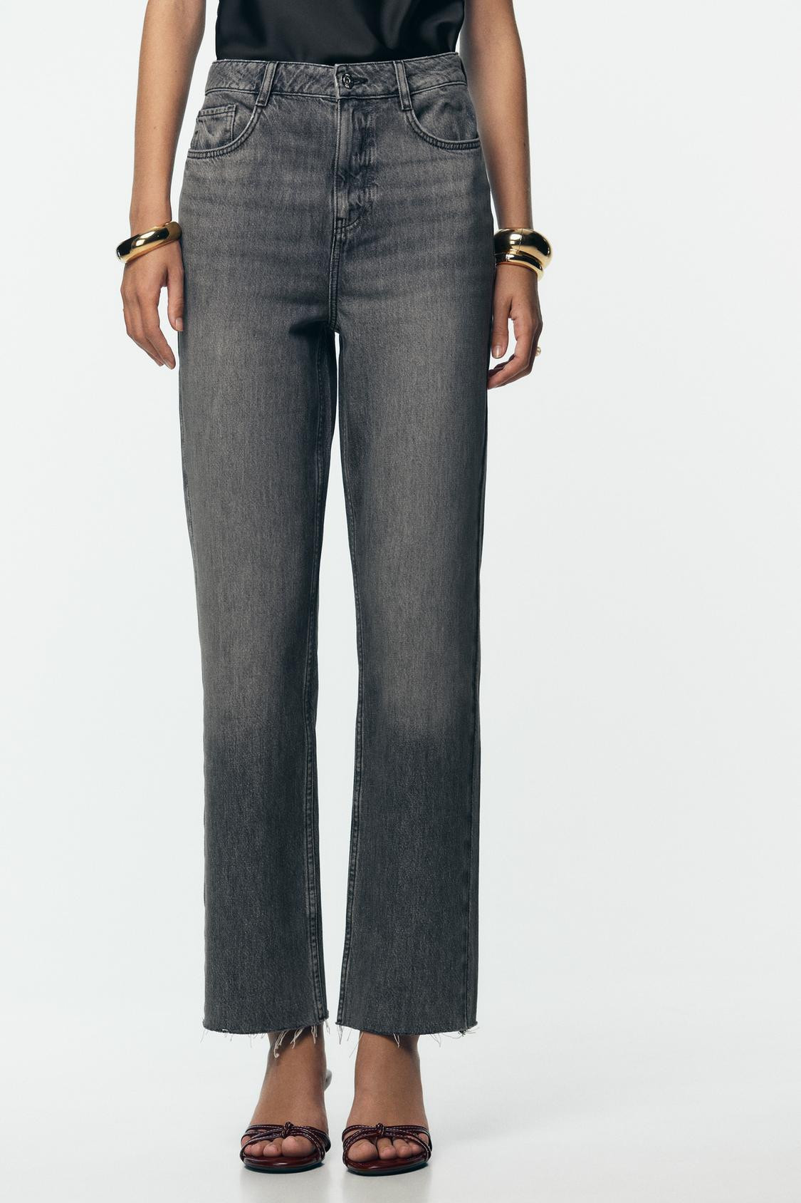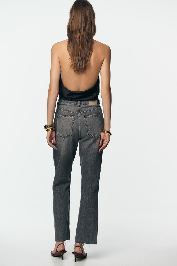 High-waist ankle jeans with five pockets. Straight leg with seamless finish. Front zip and button fastening.