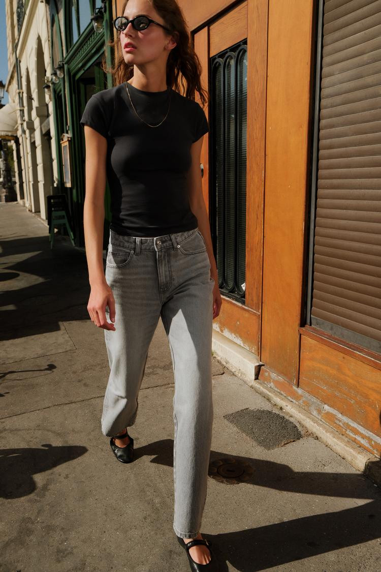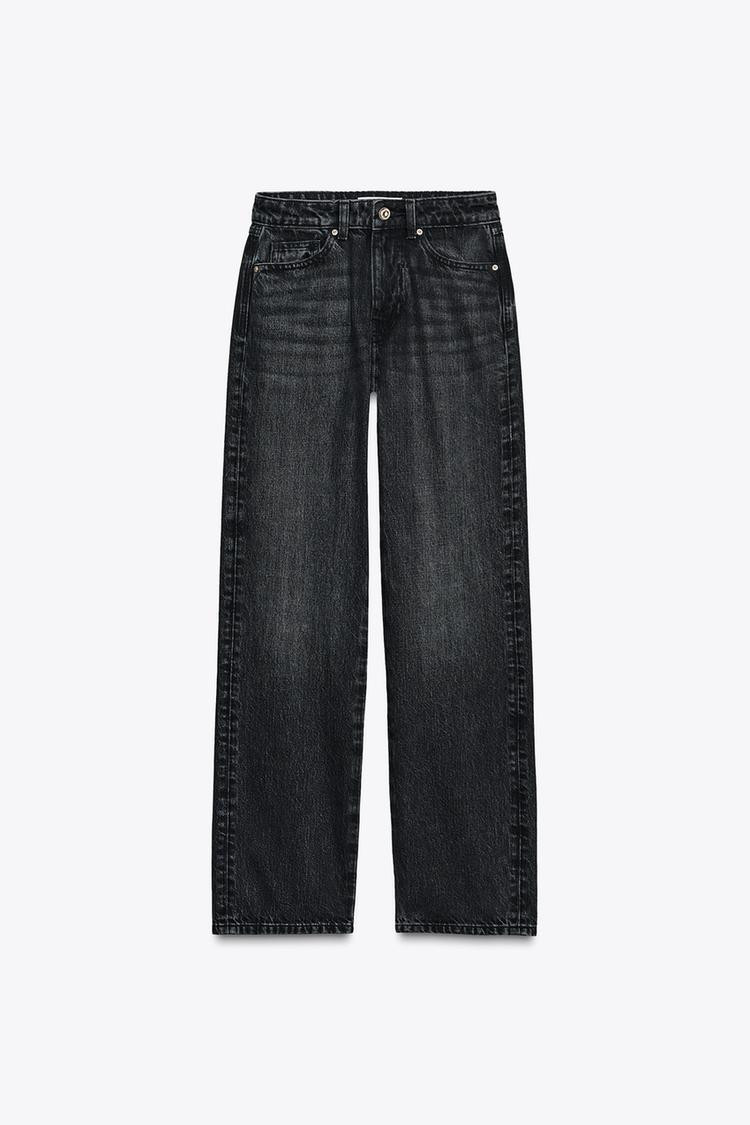 High-waist jeans with five pockets. Straight, long leg. Front zip and button fastening.