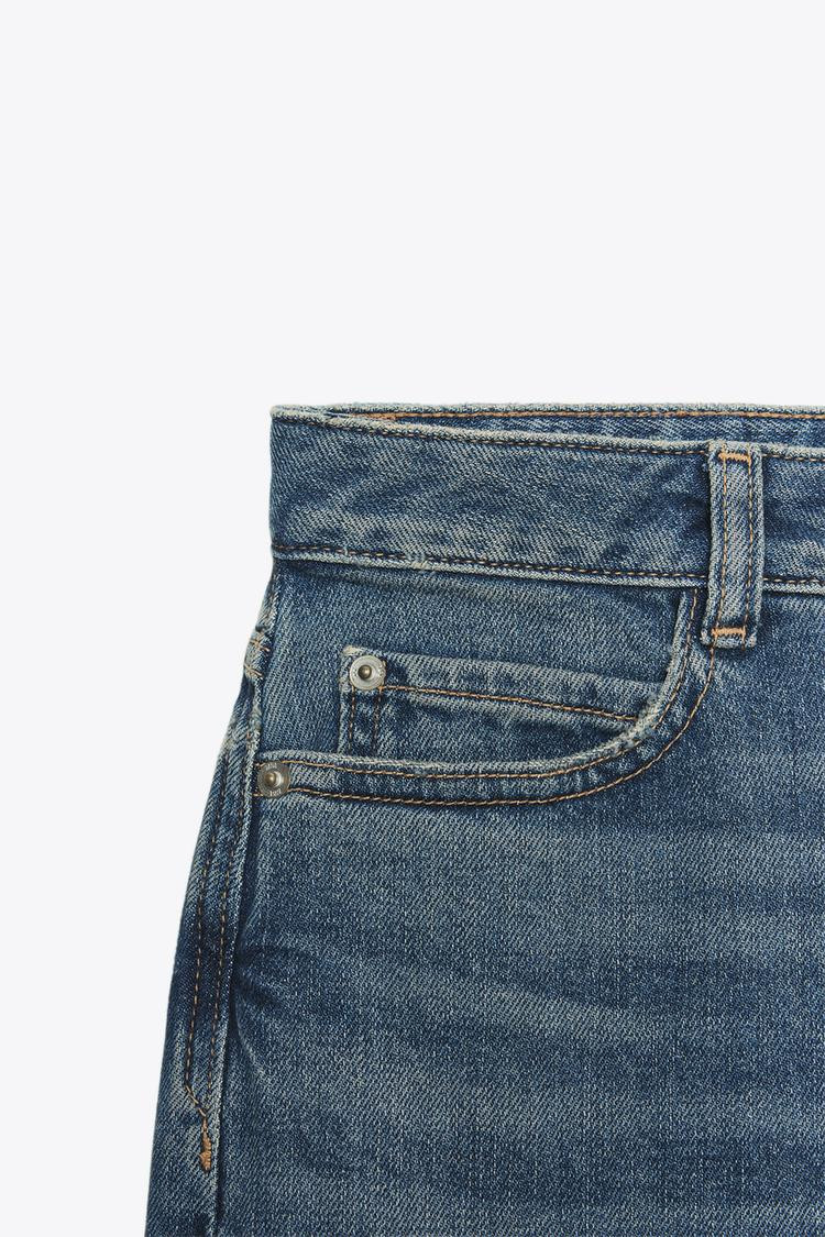 Mid-waist jeans with five pockets. Straight, loose leg. Front zip and button fastening.