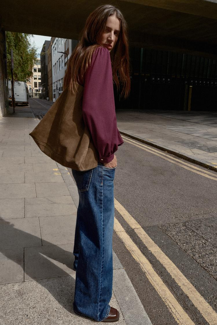Round neck blouse with long puff sleeves and buttoned cuffs. Tonal ladder stitch detail. Peplum hem. Back fastening with keyhole and button.