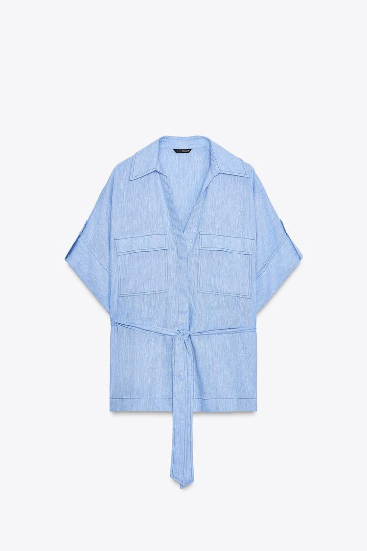 Shirt made with a linen blend. Lapel collar with V-neck and short sleeves with folded cuffs. Front patch pockets with flaps. Adjustable drawstring waist. Contrasting topstitching detail. Hem with side vents. Front fastening with hidden buttons under a placket.