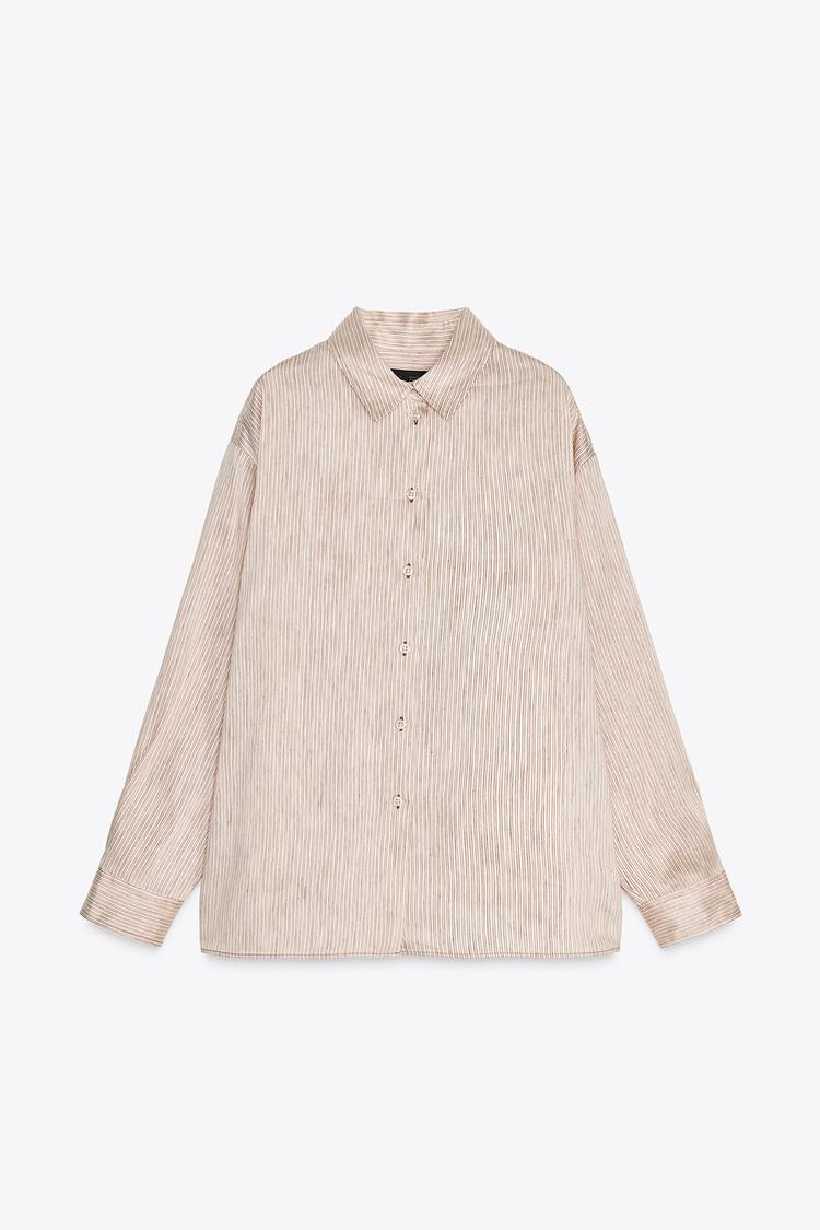 Elegant, loosely draped shirt made from high-quality spun fabric with a refined silk content and 12% linen. Features a notched lapel collar and long sleeves with classic cuffs. The rounded hem and full front button placket complete the design.