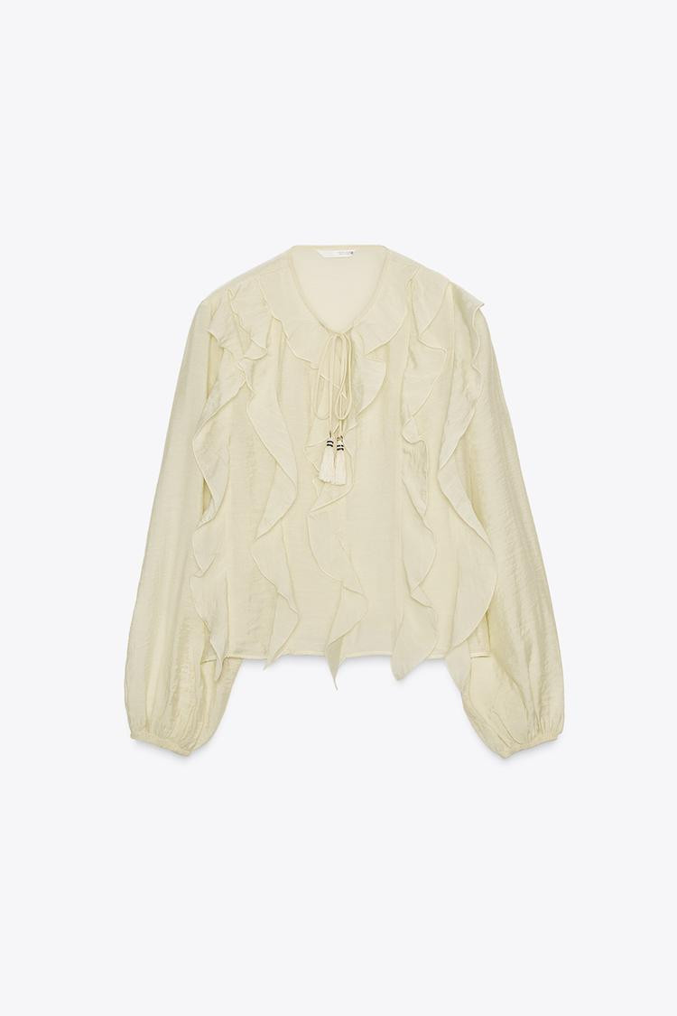 Round neck blouse with tassel drawstring detail. V-neck and long sleeves finished with elasticated cuffs. Ruffle detail.