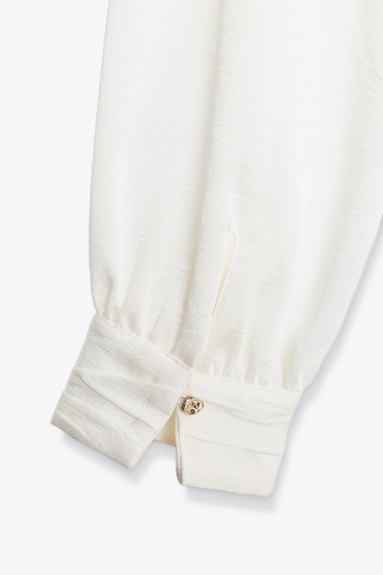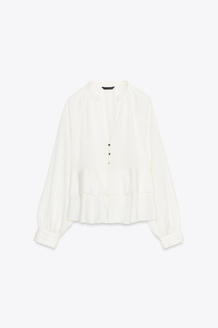 Round neck blouse with a V-neckline and metal buttons. Long sleeves with pleated cuffs. Ruffle trims.