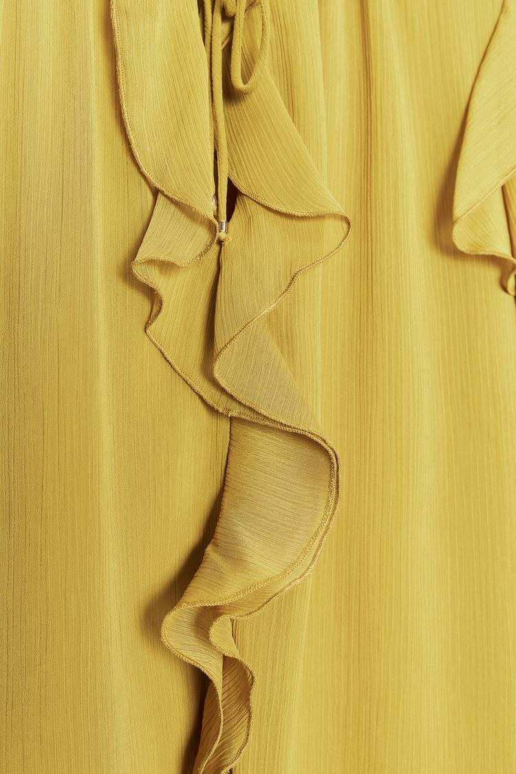 Semi-sheer round neck blouse with a tied V-neck. Long sleeves with elasticated cuffs. Ruffle detail.