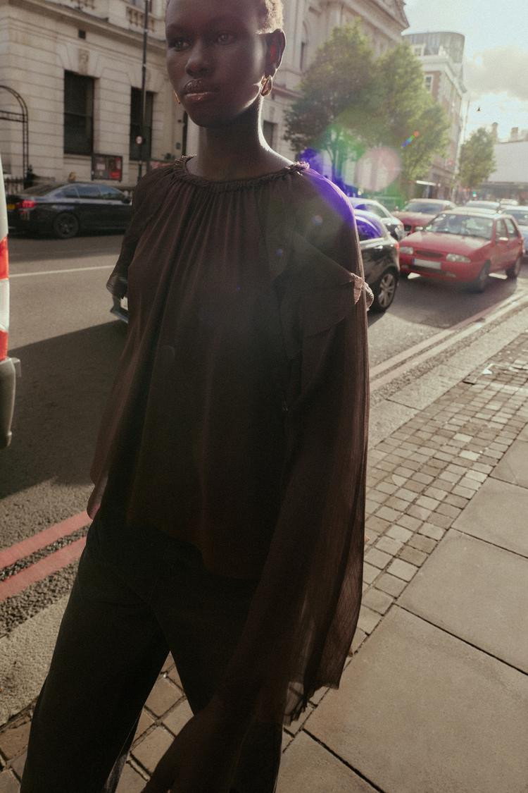 Blouse with a round neck and long sleeves. Ruffle details in the same fabric. Back fastening with an opening and ties.