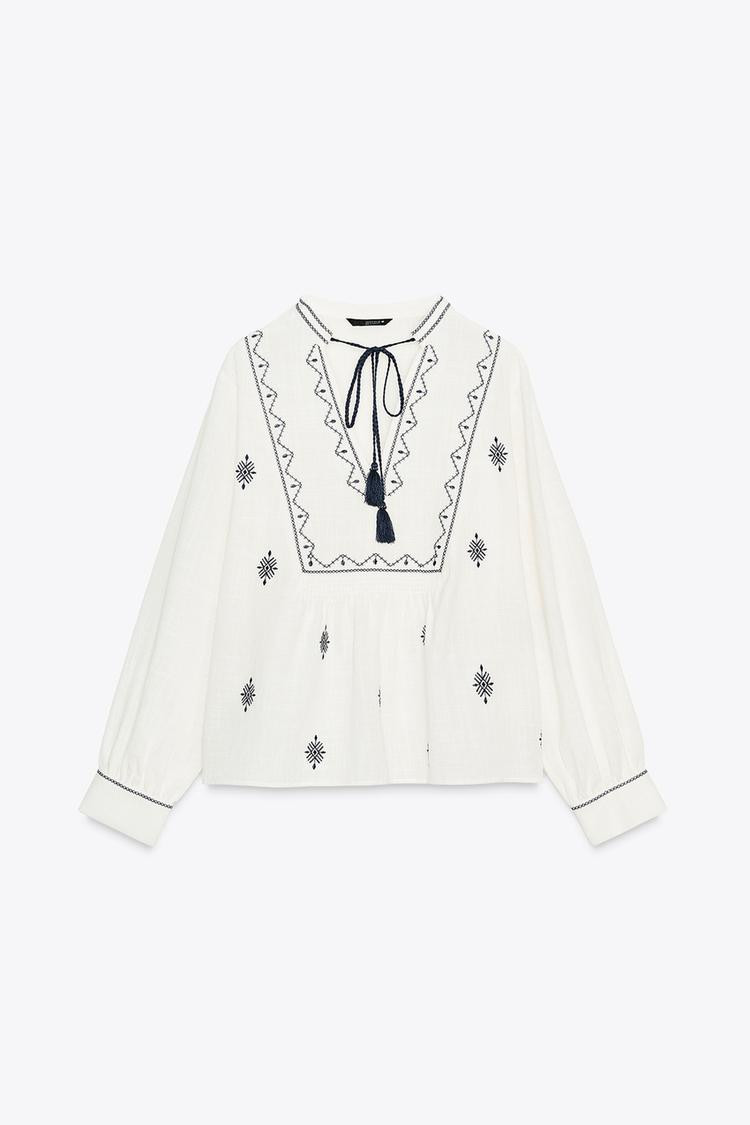 Round neck blouse with a drawstring and tassels. V-neck and long sleeves. Contrasting embroidered detail.