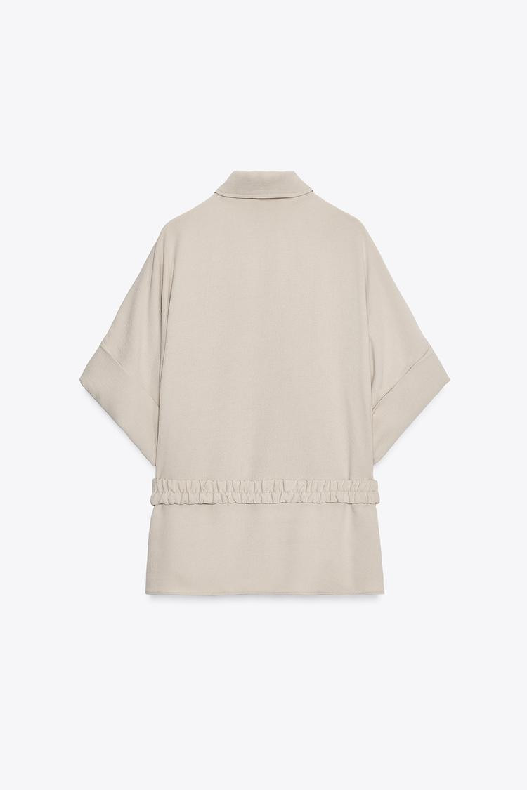 Shirt with a lapel collar and short sleeves with turn-up cuffs. Featuring front pin tuck detail and an elasticated belt with ruching. Button-up front.