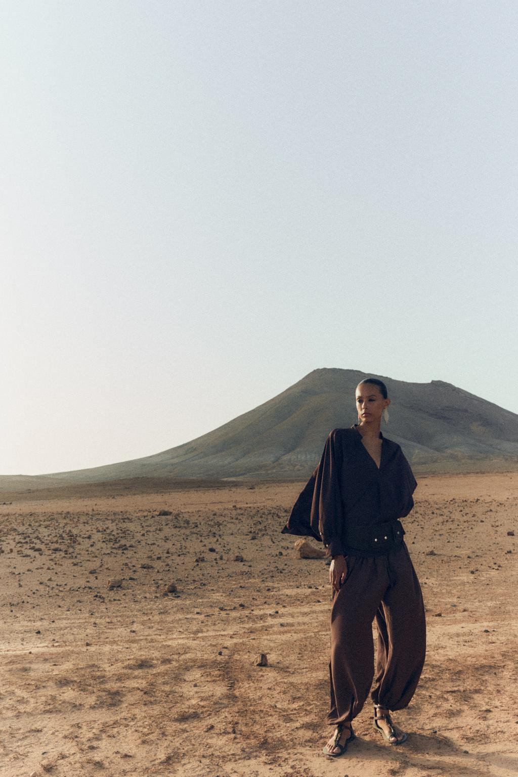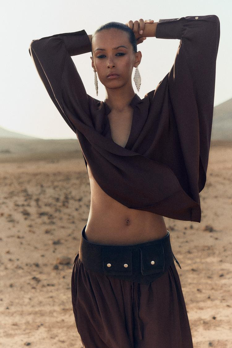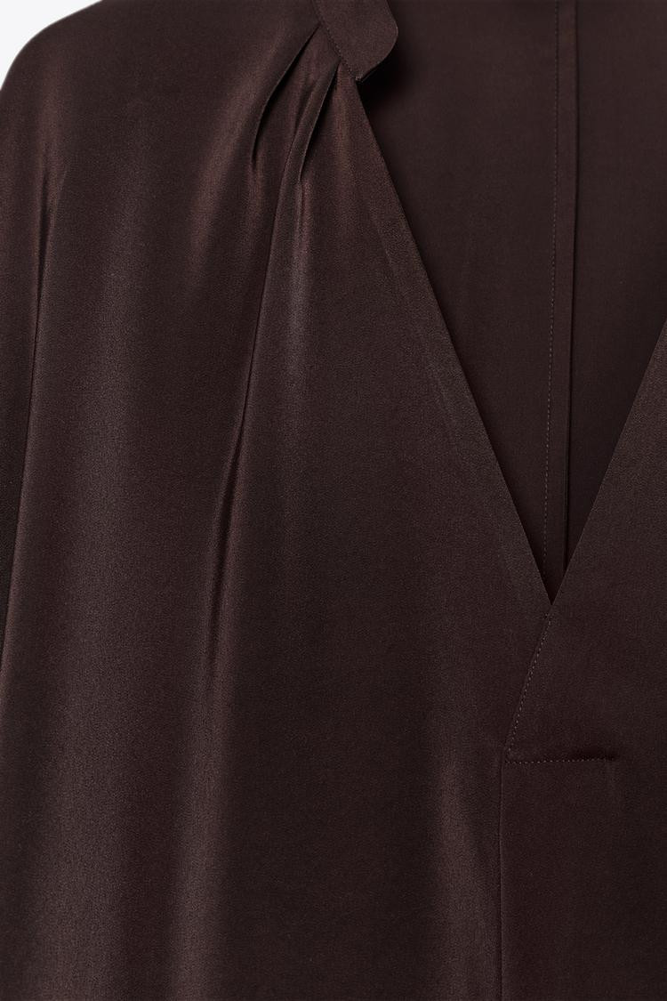 Flowing blouse with a round neck and v-neck, featuring long cape sleeves finished with cuffs.