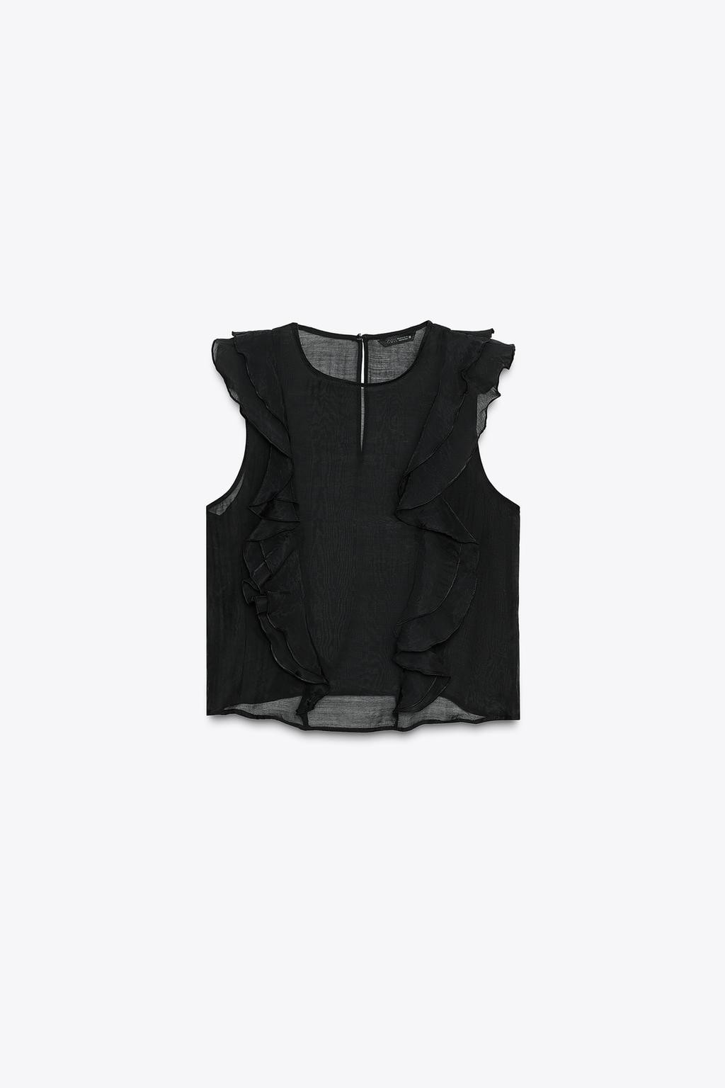 Round neck, sleeveless blouse with ruffle trims. Back fastening with an opening and concealed button.