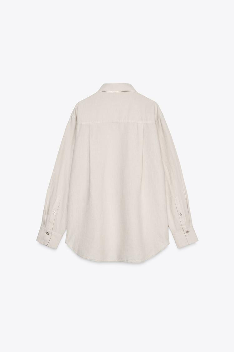 Shirt made from a blend of spun linen and cotton. Features a classic turn-down collar and long sleeves with buttoned cuffs. Designed with flap patch pockets and a rounded, asymmetrical hem. Front button fastening.