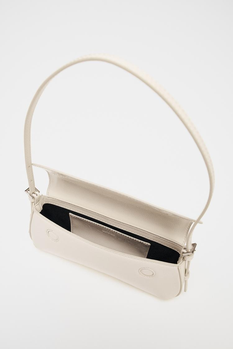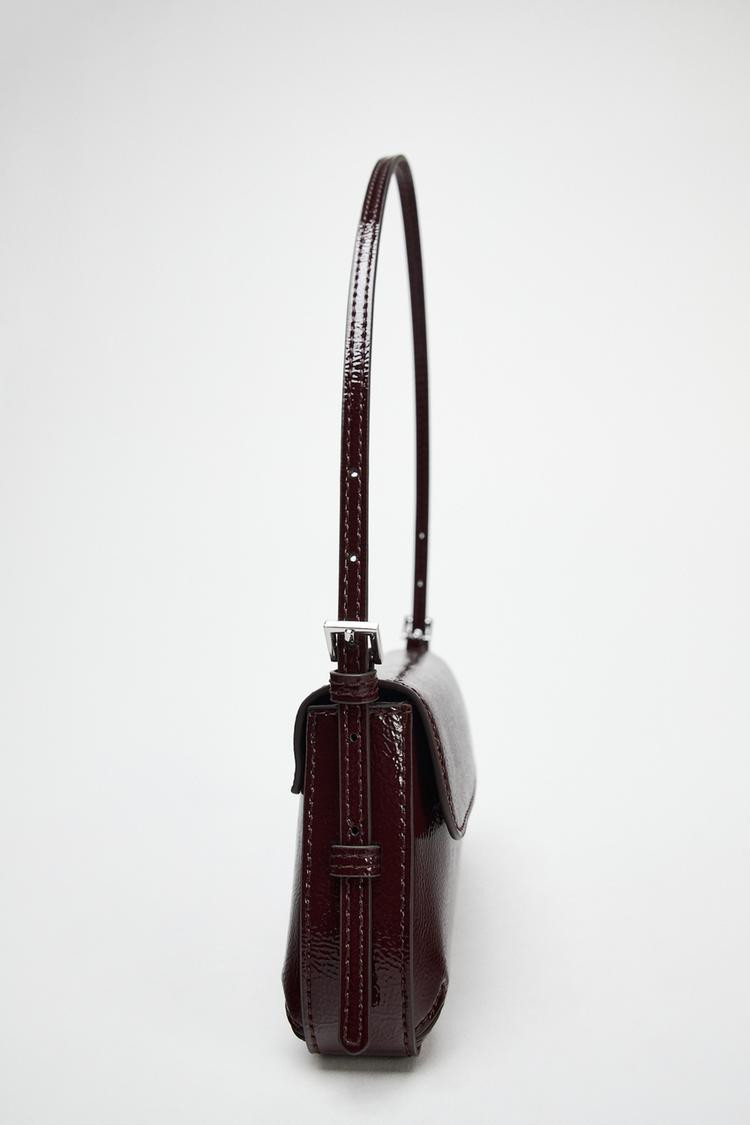 Shoulder bag with flap. Patent effect. Adjustable shoulder strap. Magnetic clasp closure.