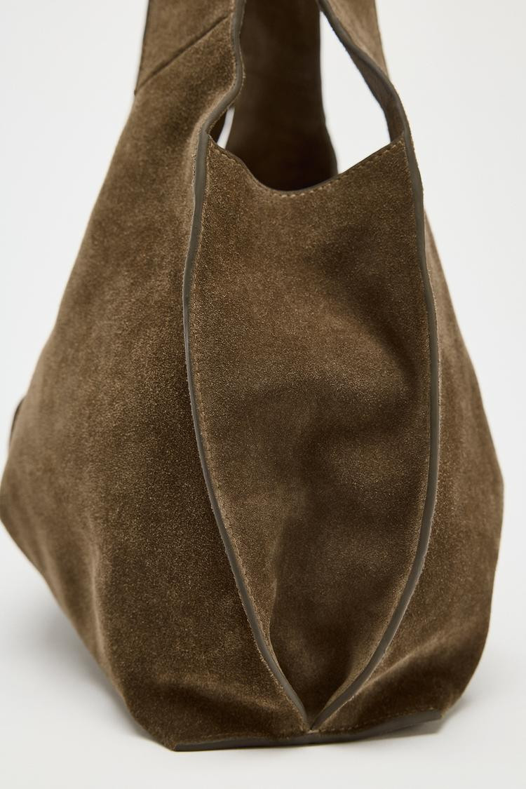 Split suede shoulder bag. Contrast topstitching detail. Interior zipped pocket. Magnetic clasp closure.