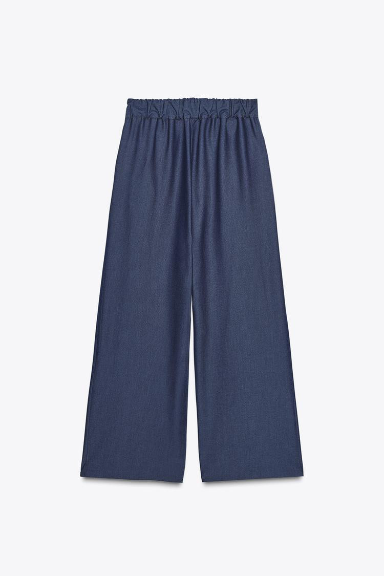 High-waist trousers with elasticated back waistband. Side pockets. Front pleat detail. Front fastening with zip fly, inside button and metal hook-and-eye closure.