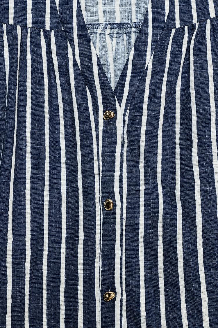 Shirt made with a linen blend. Featuring a round v-neck and short sleeves. Button-up front.