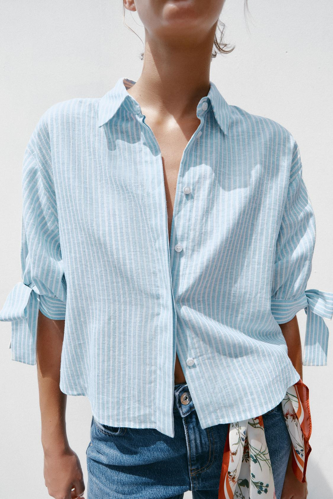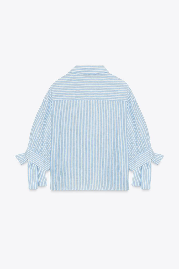 Shirt made of a linen blend with metallic thread. Featuring a lapel collar, short sleeves with bows and a front fastening with hidden buttons behind a placket.