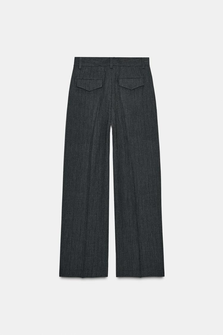 Trousers made from a yarn with 10% wool. Mid-rise and waistband with belt loops. Side pockets hidden in the seam and a flap pocket at the back. Pressed pleat detail on the front and textured fabric. Front zip, button and metal hook fastening.