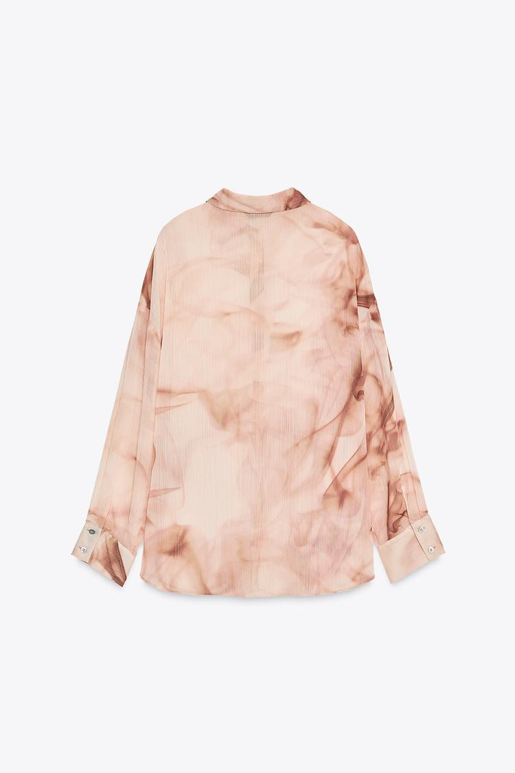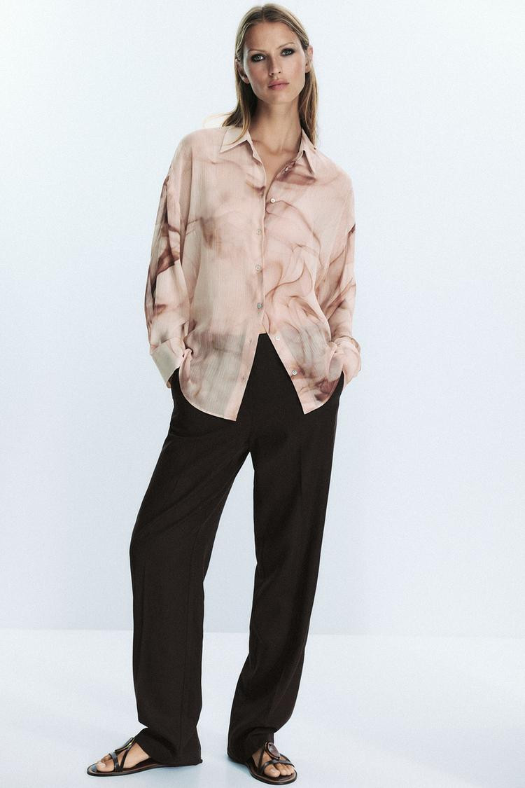 Flowing blouse with a shirt collar and long sleeves. Button-up front.