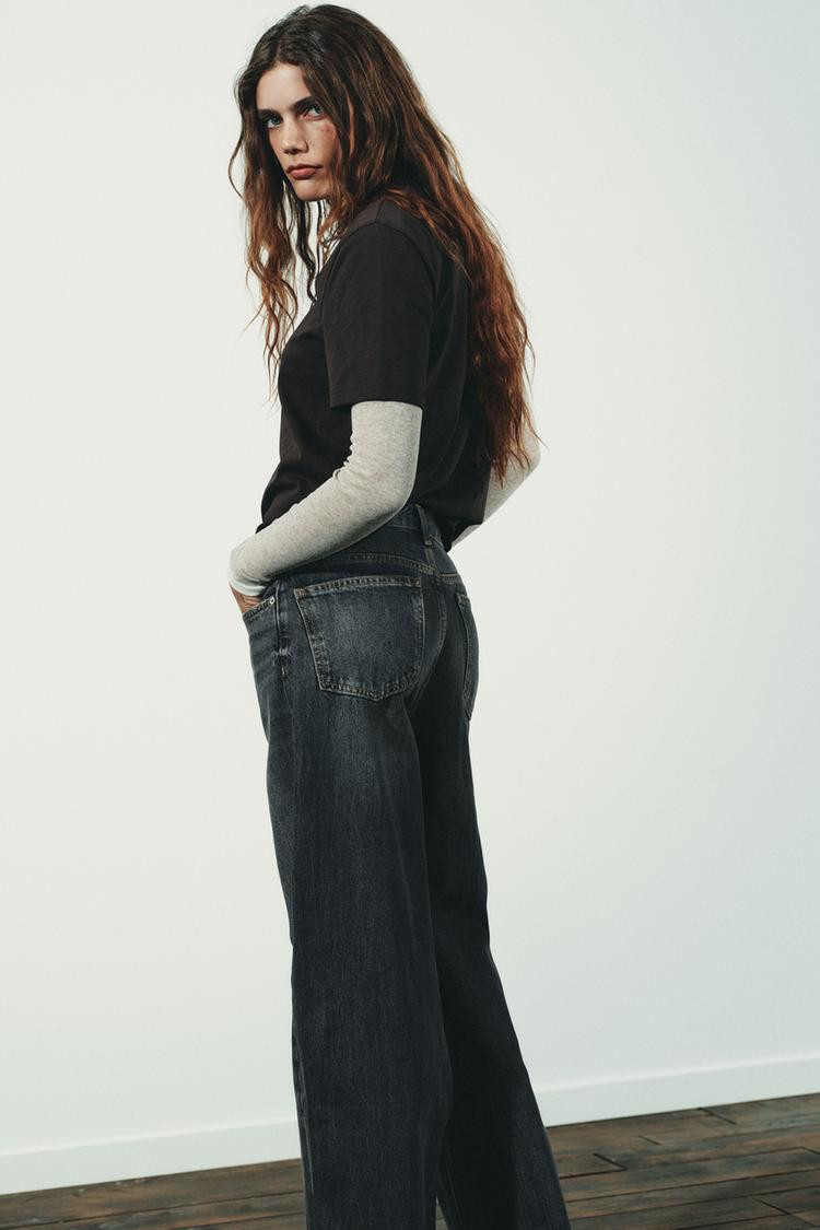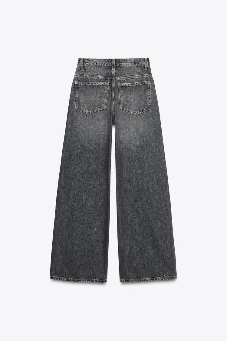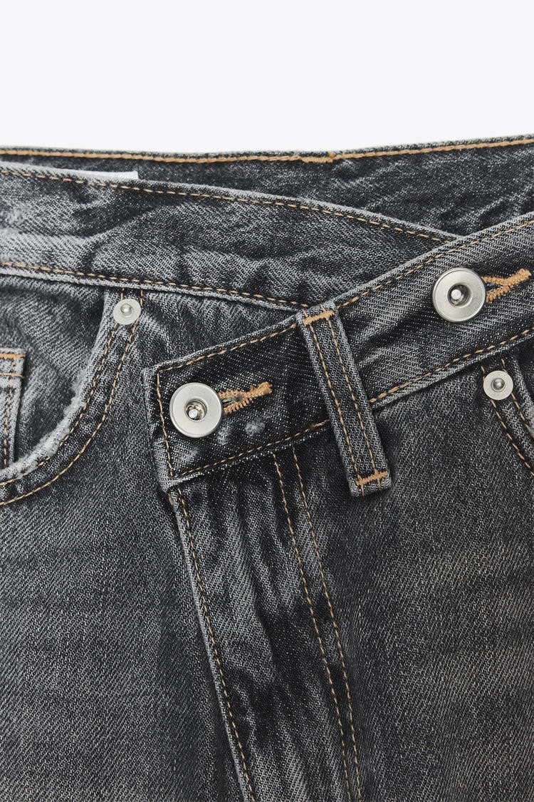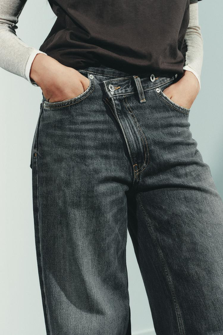 High-waist, five-pocket jeans. Extra-long wide leg. Asymmetric front fastening with zip and metal buttons..