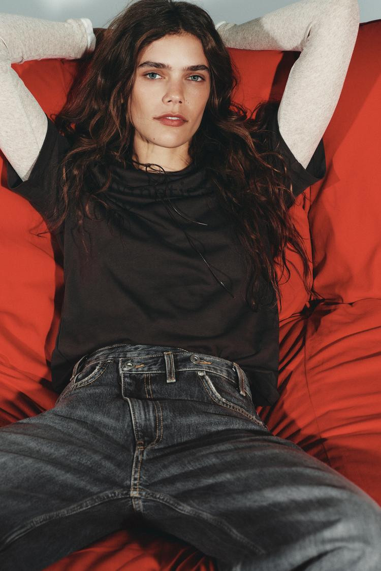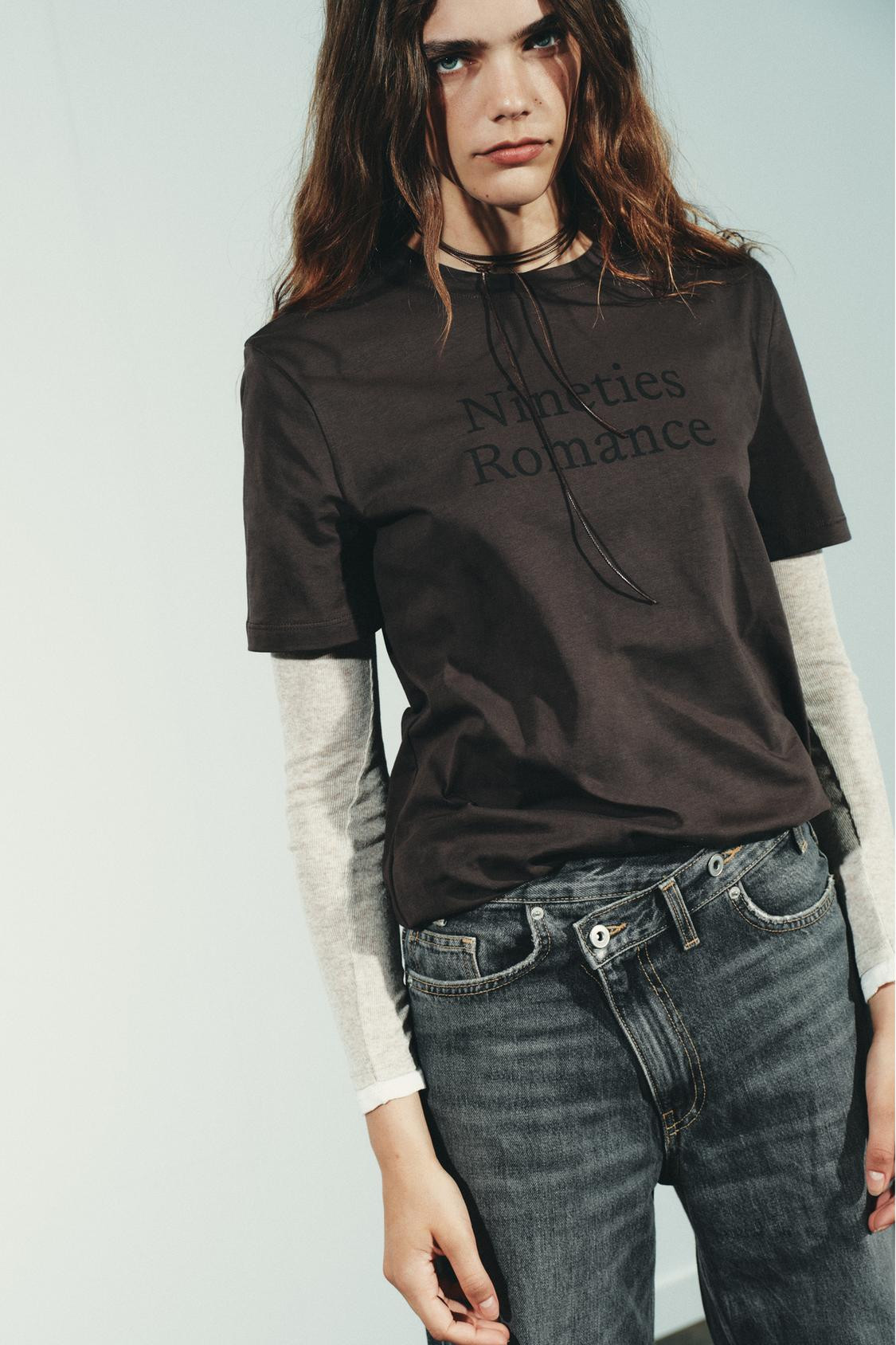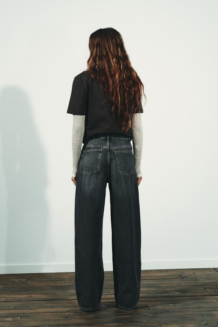 High-waist, five-pocket jeans. Extra-long wide leg. Asymmetric front fastening with zip and metal buttons..