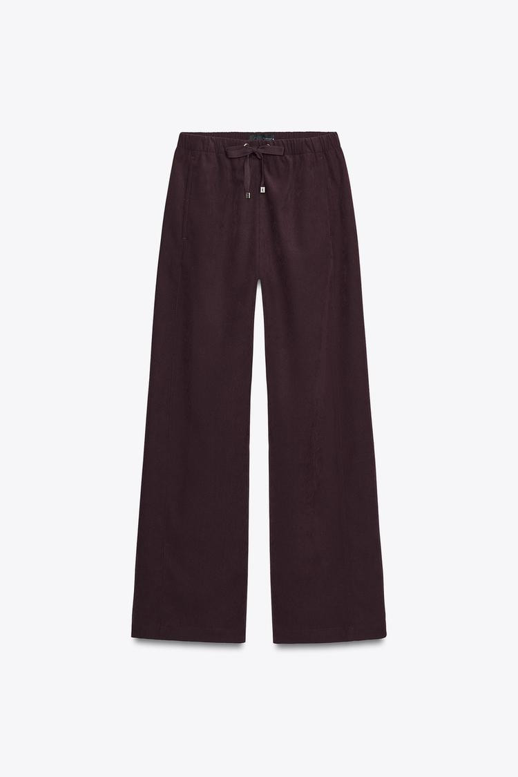 High-waist trousers featuring an elasticated drawstring waistband. Side pockets and patch pockets on the back. Wide leg.