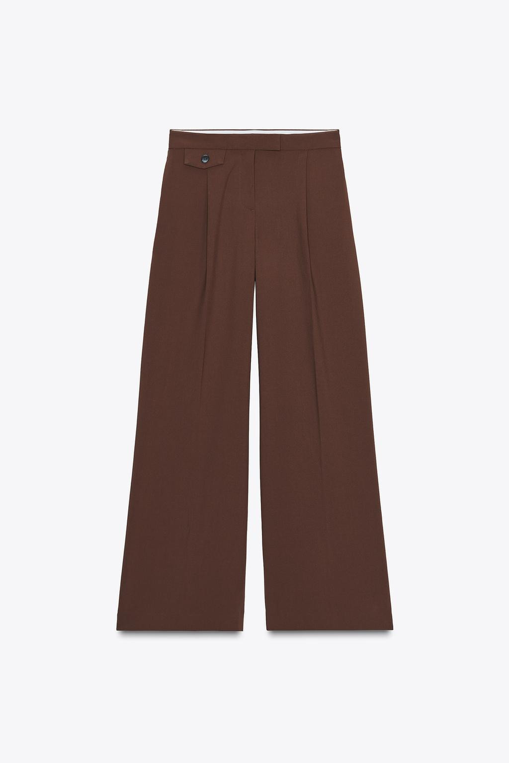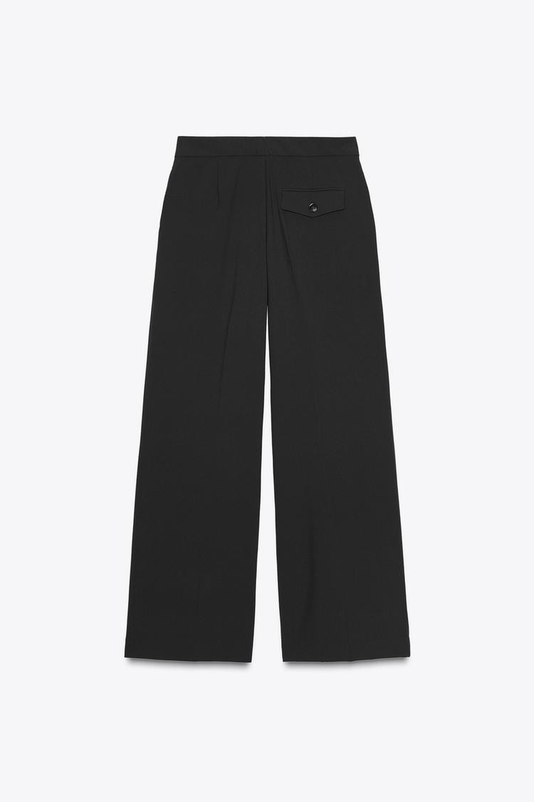 High-waist trousers with darts and front pockets. Featuring flap detail on the front and back. Wide leg. Front fastening with zip, inside button and hook.