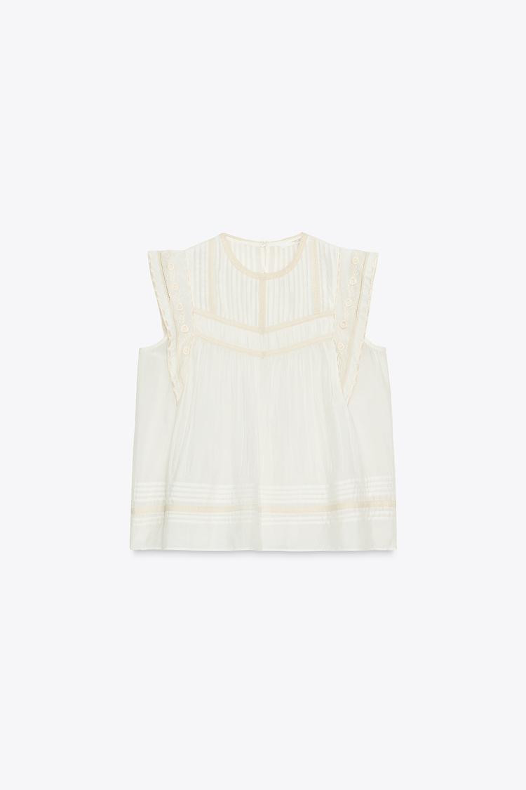 Blouse made from a viscose and cotton blend yarn. Round neck and sleeveless design with a frill. Contrasting embroidered detail. Back fastening with opening and button.