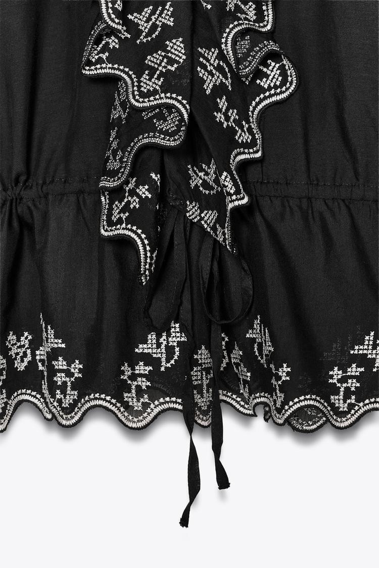 Blouse made from a viscose and cotton blend. V-neck and long sleeves with elasticated cuffs and a ruffle trim. Features contrasting embroidered detail. Ruffled hem.