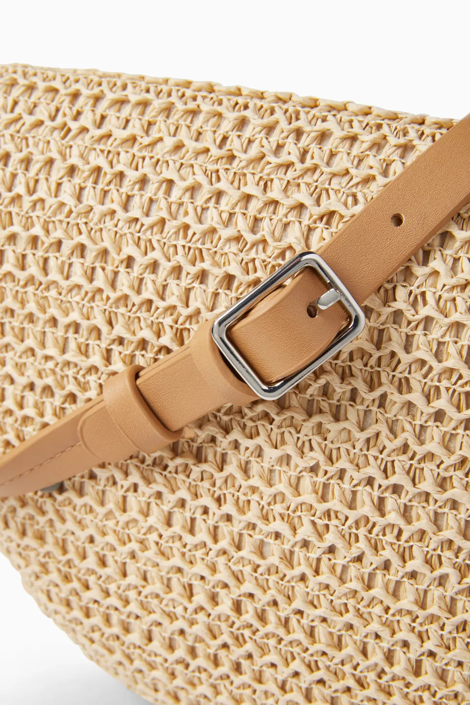 Semi-circular straw shoulder bag. Main compartment with flap, magnetic closure, lightweight woven lining, and a small zippered pocket. Adjustable imitation leather strap with a square metal buckle.