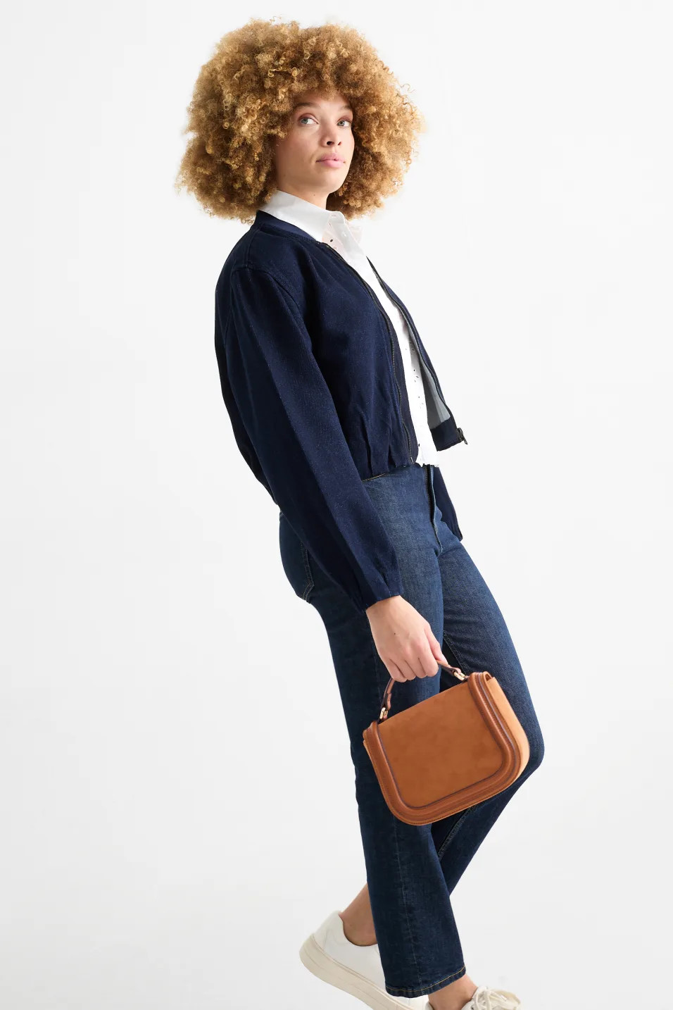Shoulder bag made of smooth and imitation suede. Main compartment with flap, lightweight woven lining, and a small slip pocket. Adjustable, removable strap with snap hook.