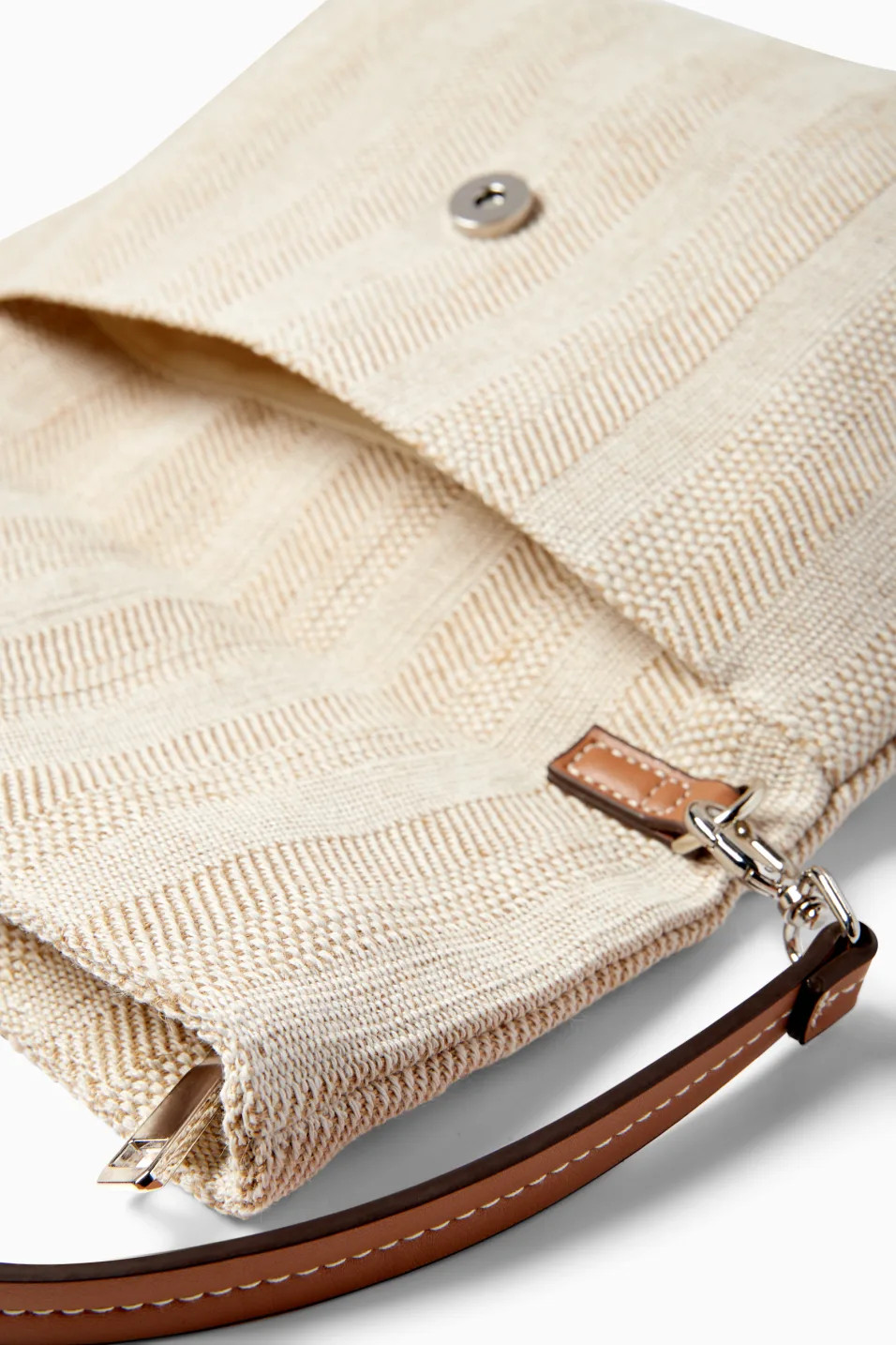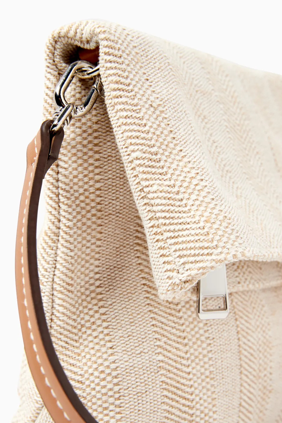 Shoulder bag made of sturdy woven fabric with a striped pattern. Main compartment with flap, zipper, magnetic snap closure, and lightweight lining. Additional slip pocket. Adjustable, removable faux leather strap with snap hook.