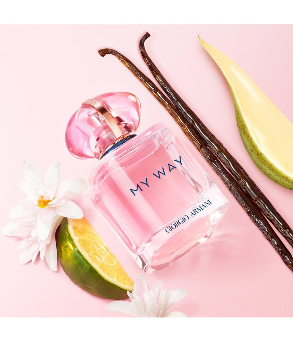 My Way Eau de Parfum Nectar is a floral-fruity fragrance that invites you on a sensorial journey of self-expression and free femininity. Crafted with naturally sourced ingredients from across the globe, it opens with a juicy pear and vibrant rhubarb accord, followed by sparkling bergamot and orange blossom. The heart reveals a creamy white floral bouquet, centered around Tuberose Absolute. The base blends warm cedarwood and white woods with comforting Bourbon Vanilla and soft white musk, leaving a sensual, luminous trail. A celebration of conscious beauty and modern elegance.