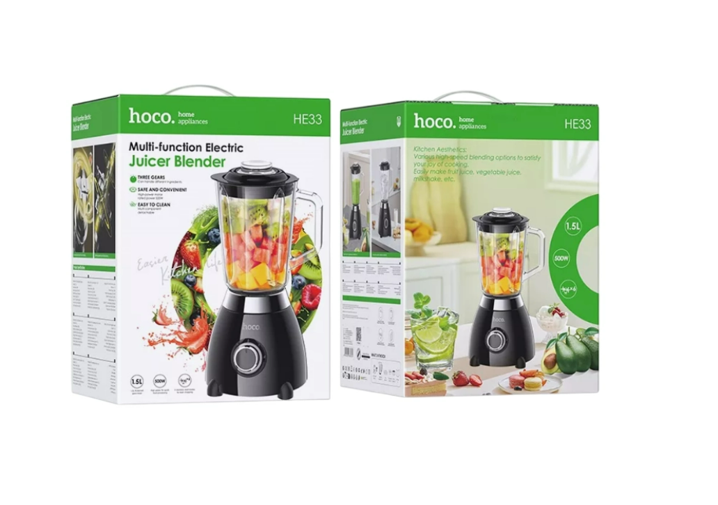 By choosing a blender with a HOCO HE33 juicer, you will have a powerful, functional and reliable assistant in your kitchen to prepare a variety of dishes and drinks.ender with a HOCO he33 juicer is easy and quick to wash, which significantly simplifies the process of caring for the device. Thanks to its compact size and convenient handle, the blender is easy to store and move, which makes it an indispensable assistant in the kitchen.