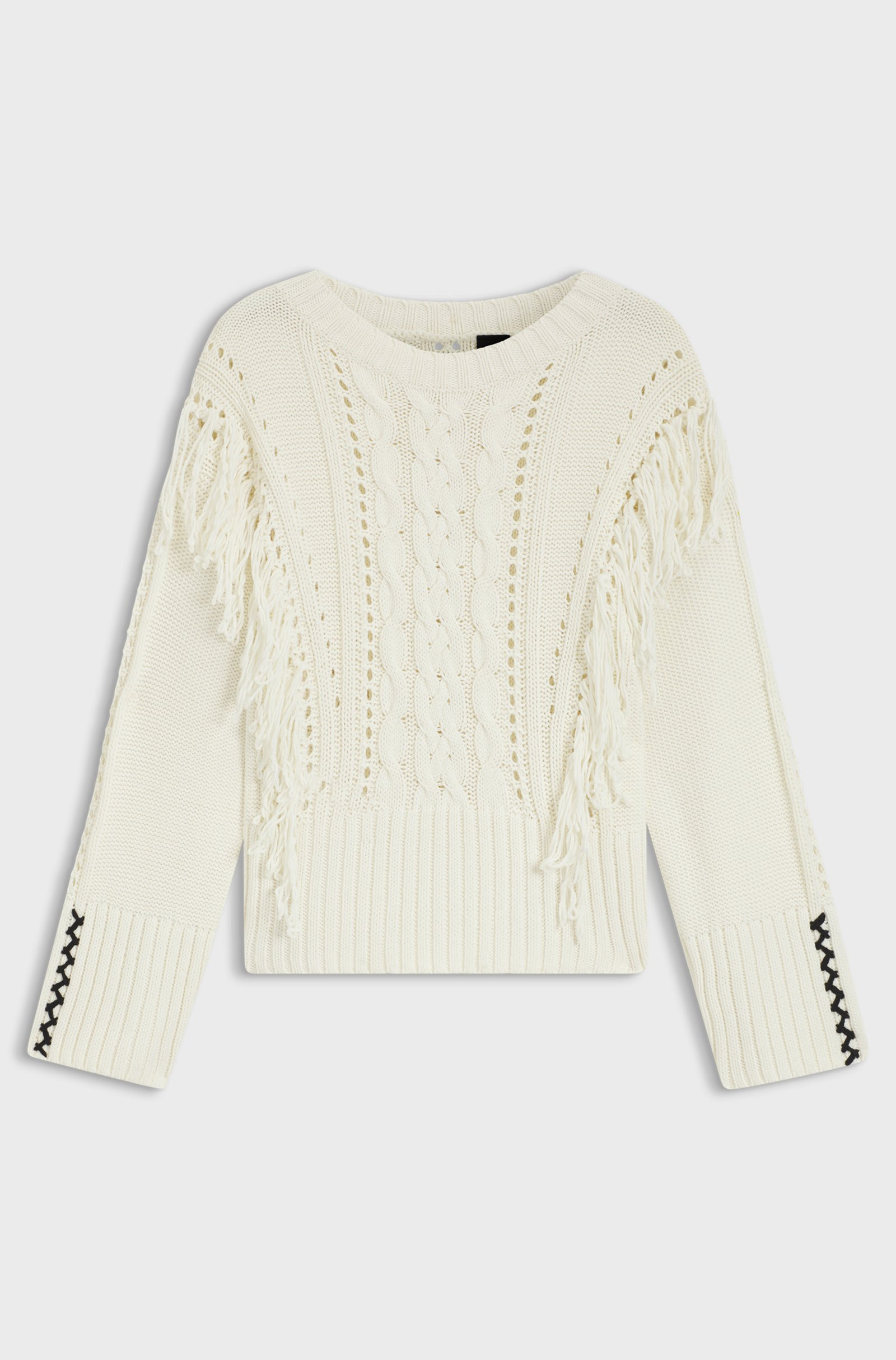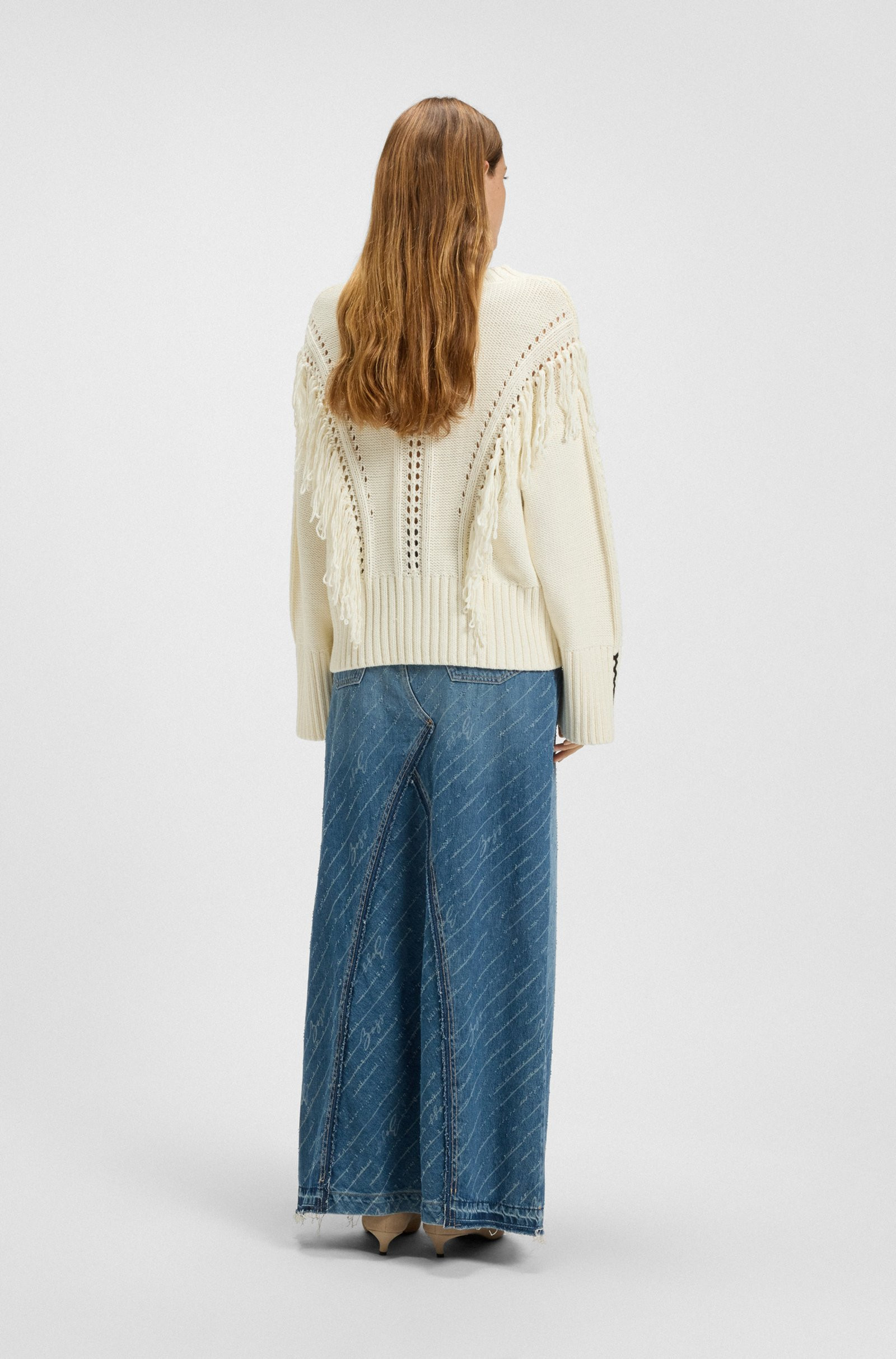 Drawing inspiration from Western styling, this cotton-blend BOSS Womenswear sweater combines classic cabling with fluid fringing. Subtle logo charm. Open-work contrast stitching. This product contains at least 60% better raw materials. This product is partly made with organic cotton. Our organic standards do not allow the use of synthetic fertilisers, pesticides or genetically modified seeds.
