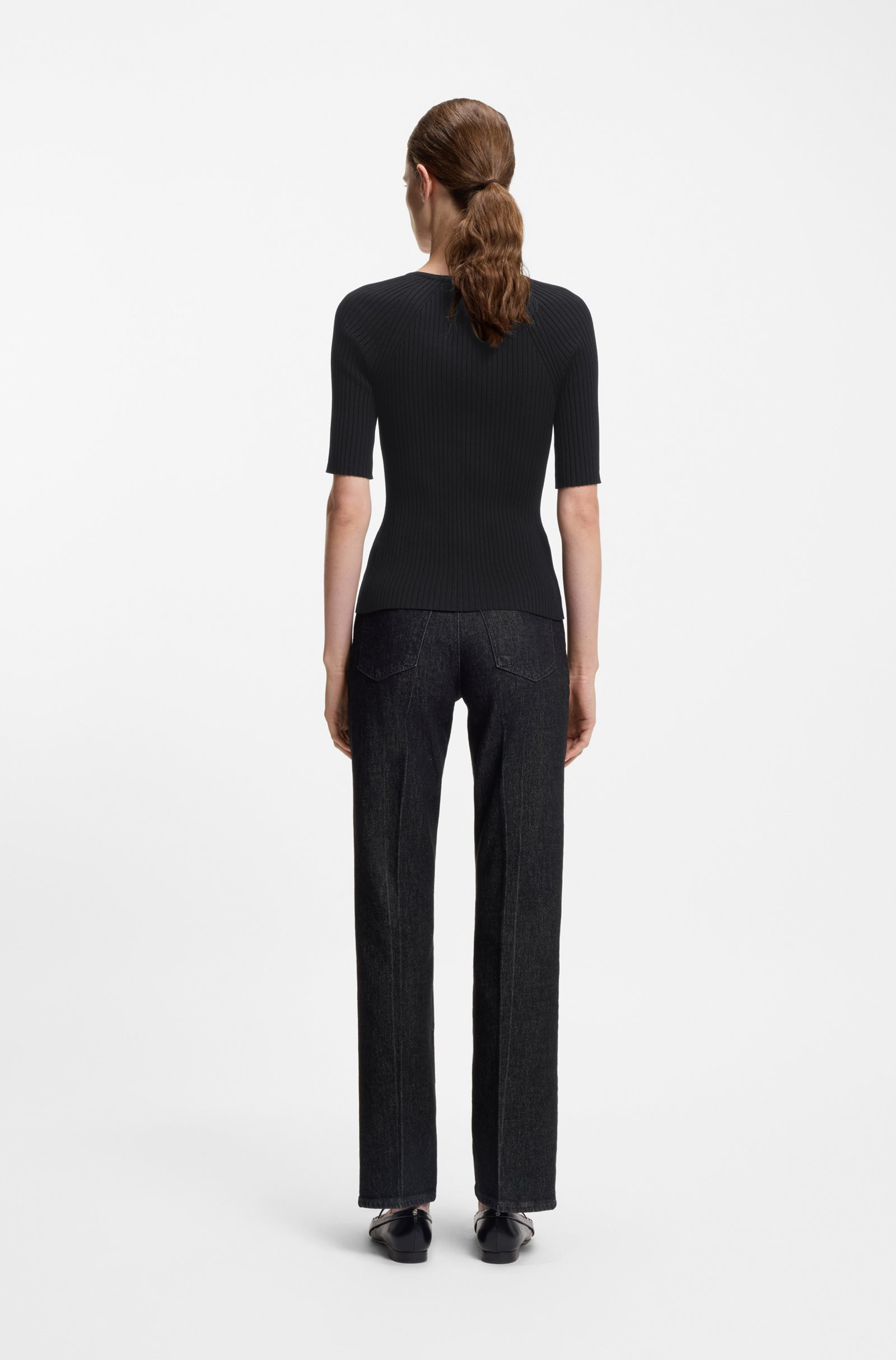 In comfortable stretch fabric with a subtle sheen, this BOSS Womenswear knit T-shirt has tonal button trims for an elegant touch. Machine washable.