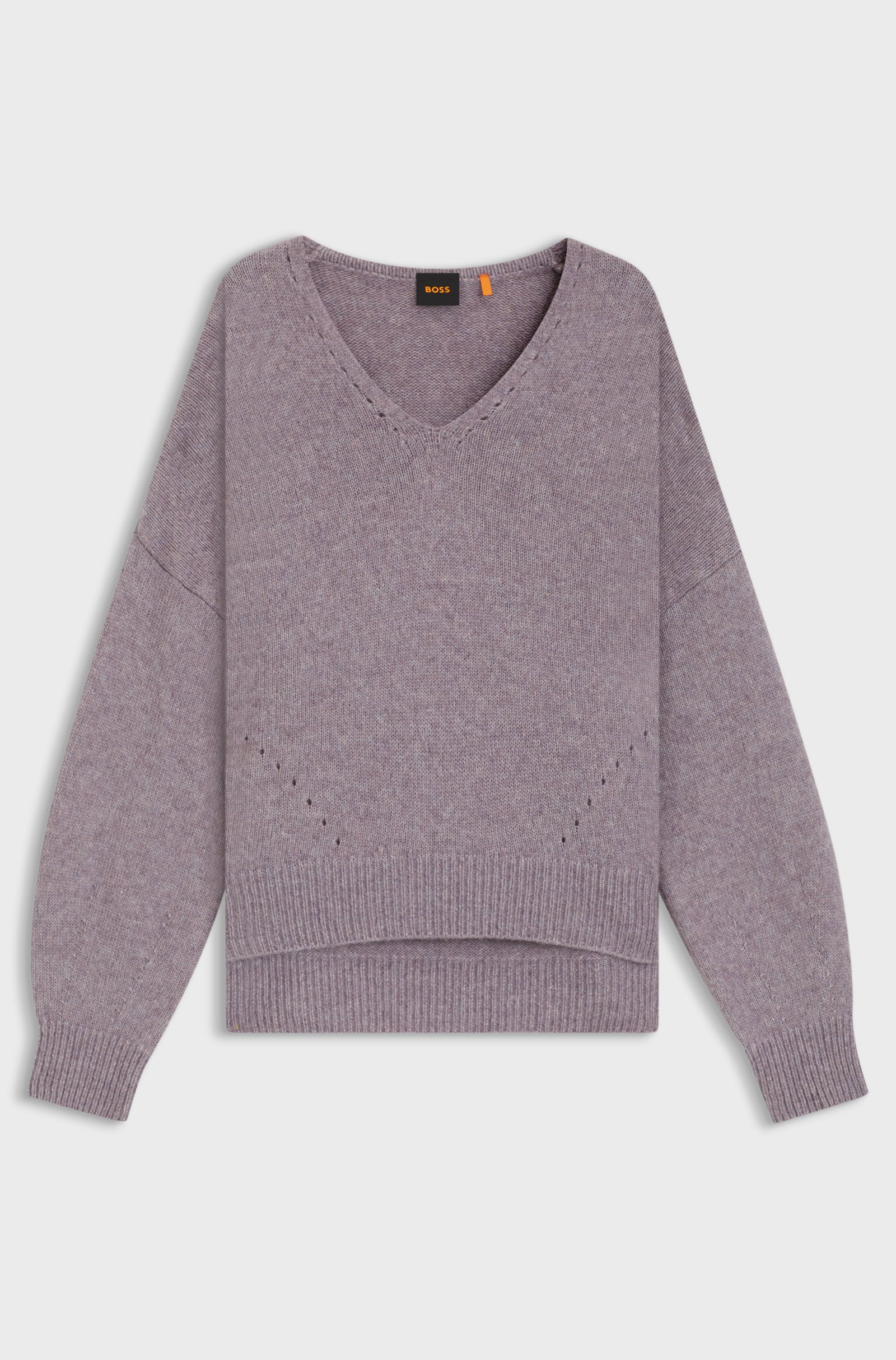 Featuring elegant open-knit details, this BOSS Womenswear sweater is crafted in finest Italian yarn with alpaca and wool. Relaxed fit. V neckline.