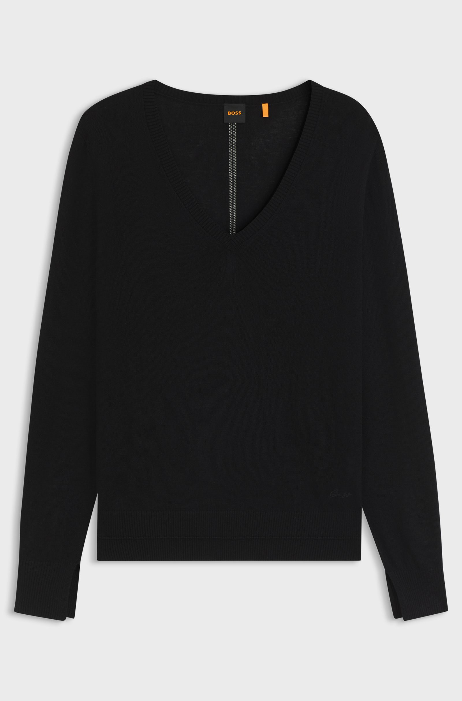 Blended with cashmere in a fine-gauge knit, this BOSS Womenswear sweater is elegantly detailed with openwork stitching and slit cuffs. V neckline. Embroidered logo. This product is made with cellulose fibres, derived from natural raw wood material and sourced from responsibly managed forests. We cooperate with external organisations to ensure respectful treatment of virgin and endangered forests.