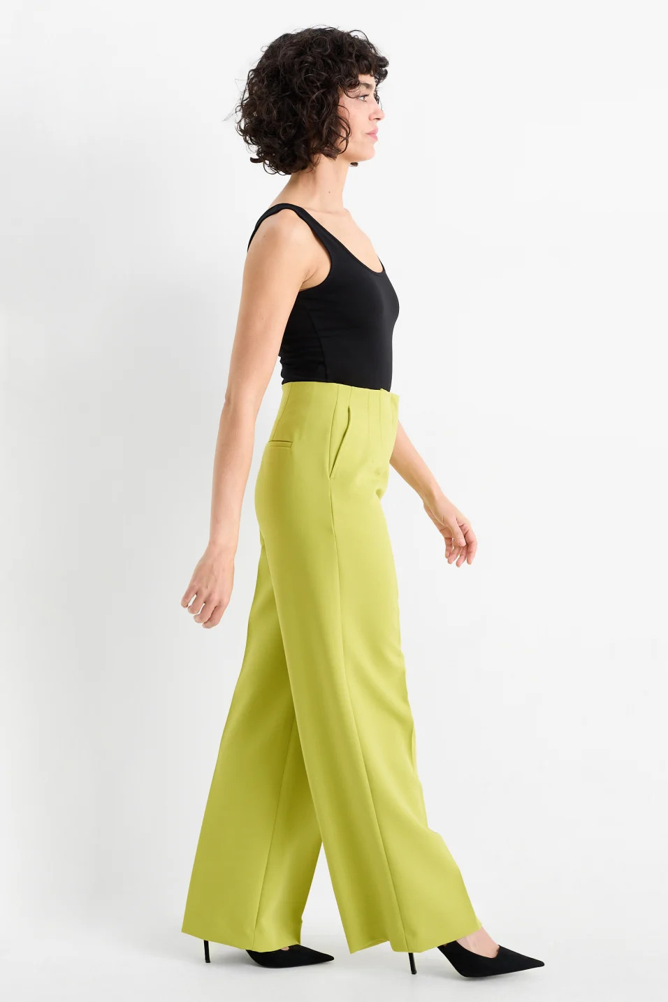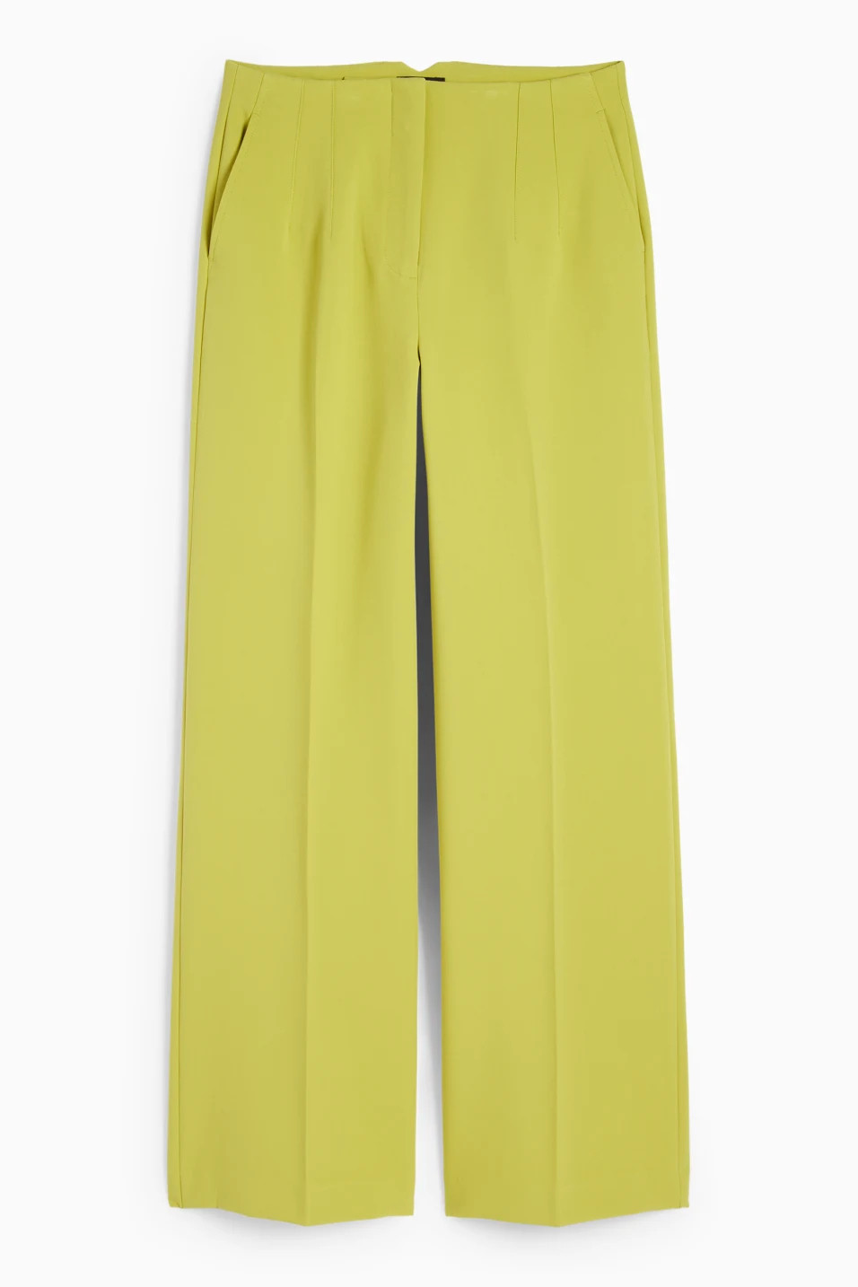 Business trousers made of woven fabric. Creases and two side pockets and two mock back pockets.