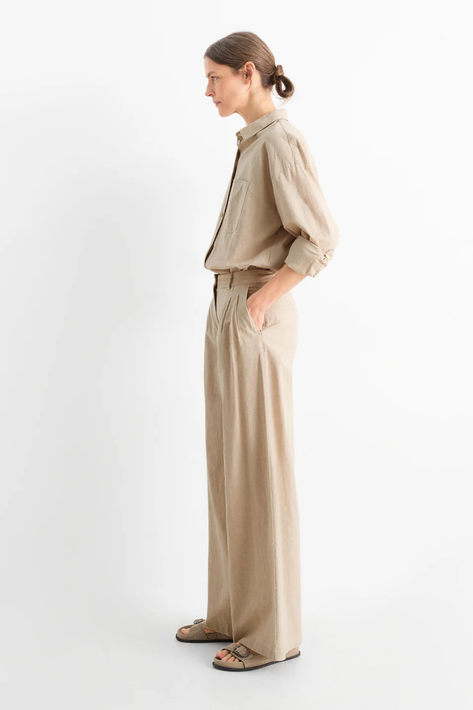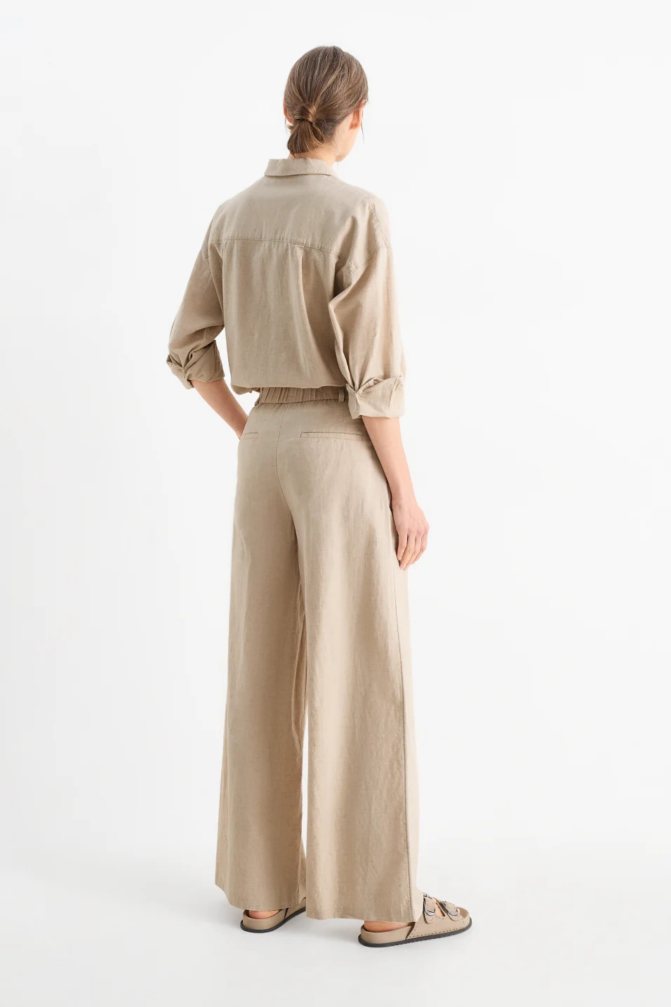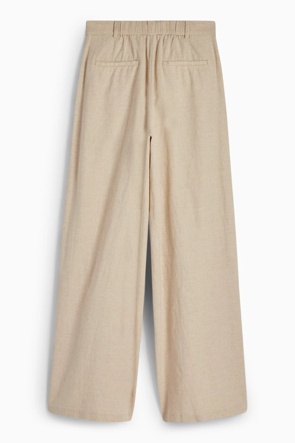 Fabric trousers in a lightweight linen blend. Elastic insert at the back waistband and two side and back pockets.