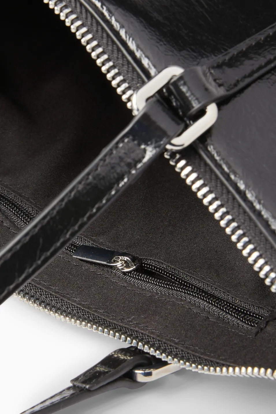 Shoulder bag made of grained faux leather with a patent finish. Main compartment with zipper closure, lightweight woven lining, and a small zippered pocket. Detachable key ring with various metal charms.