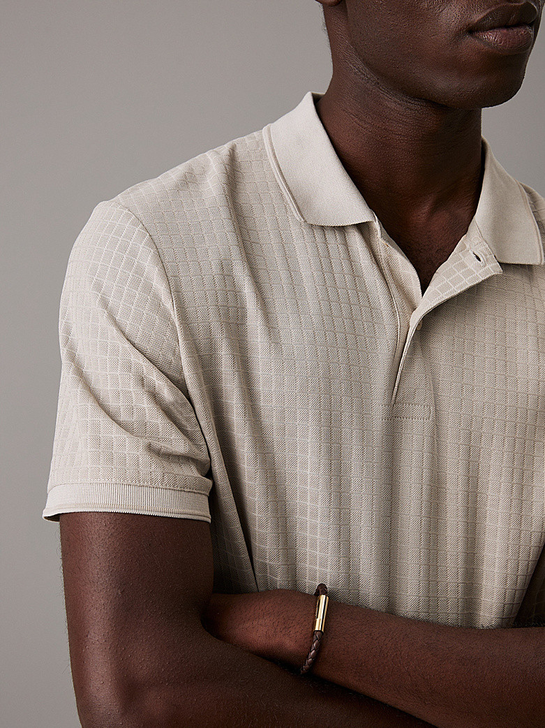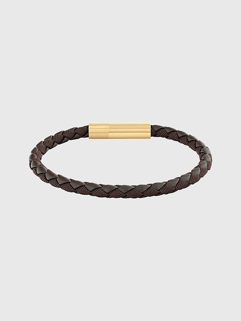 This braided leather bracelet features engraved logo metal elements with a linear pattern.