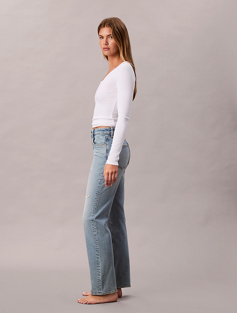 • Straight high-rise fit: sits on the hip, straight leg