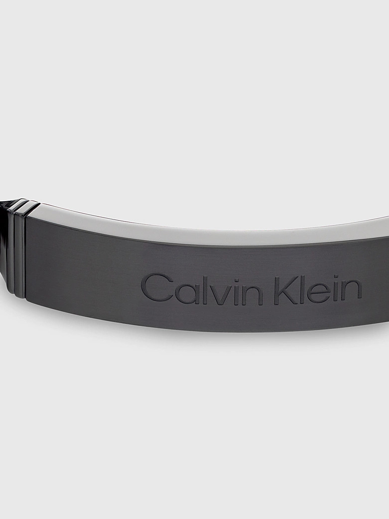 Braided leather bracelet with an iconic logo pendant made of black ion-plated stainless steel and a hook closure.