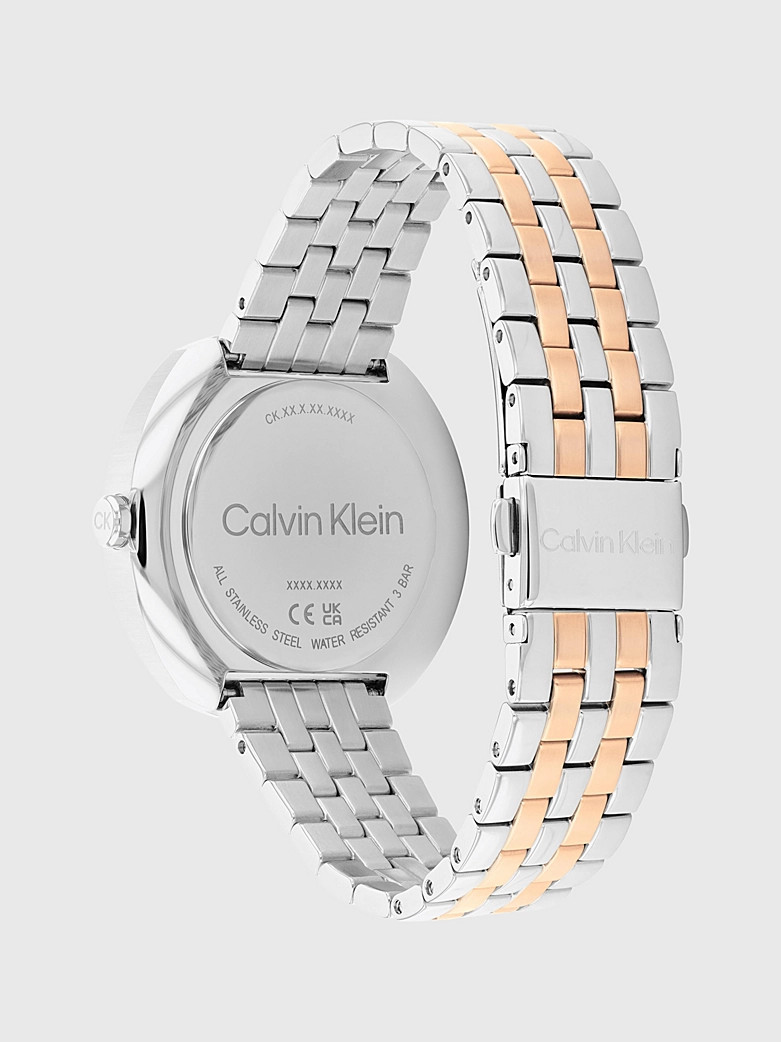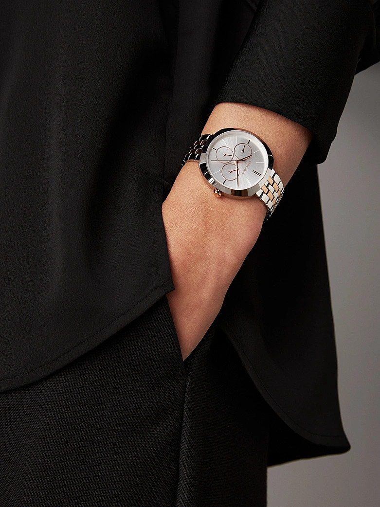 A distinctive two-tone watch with a soft geometric bezel and multifunction dial. Featuring a three-hand design on a link bracelet.