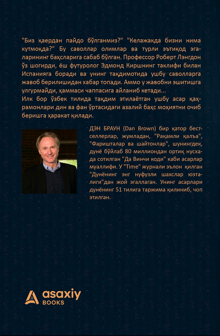 Robert Langdon, Harvard professor of symbology and religious iconology, arrives at the Guggenheim Museum Bilbao to attend the unveiling of a discovery that “will change the face of science forever”. The evening’s host is his friend and former student, Edmond Kirsch, a forty-year-old tech magnate whose dazzling inventions and audacious predictions have made him a controversial figure around the world. This evening is to be no exception: he claims he will reveal an astonishing scientific breakthrough to challenge the fundamentals of human existence.
