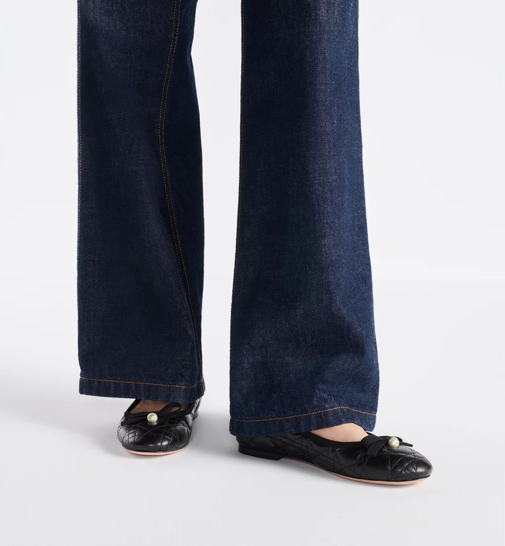 The Dior Ballet Ballerina features a timeless pattern in the Maison's couture style. A delicate grosgrain ribbon bow with a white resin CD pearl, inspired by the signature Dior Tribales earrings, accentuates the black calfskin design with a quilted Cannage motif. The pleasantly soft shoe features a padded leather insole and stylishly completes any look this season.