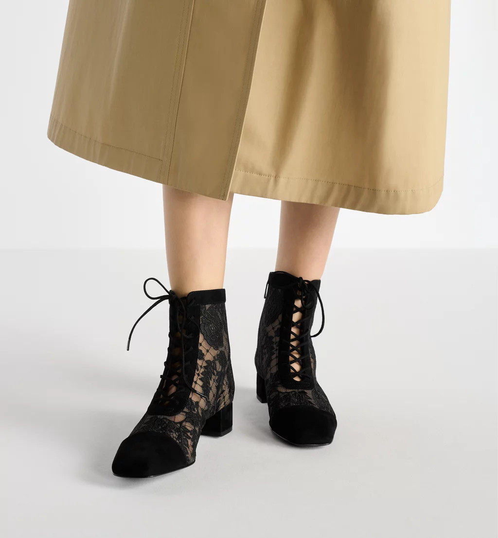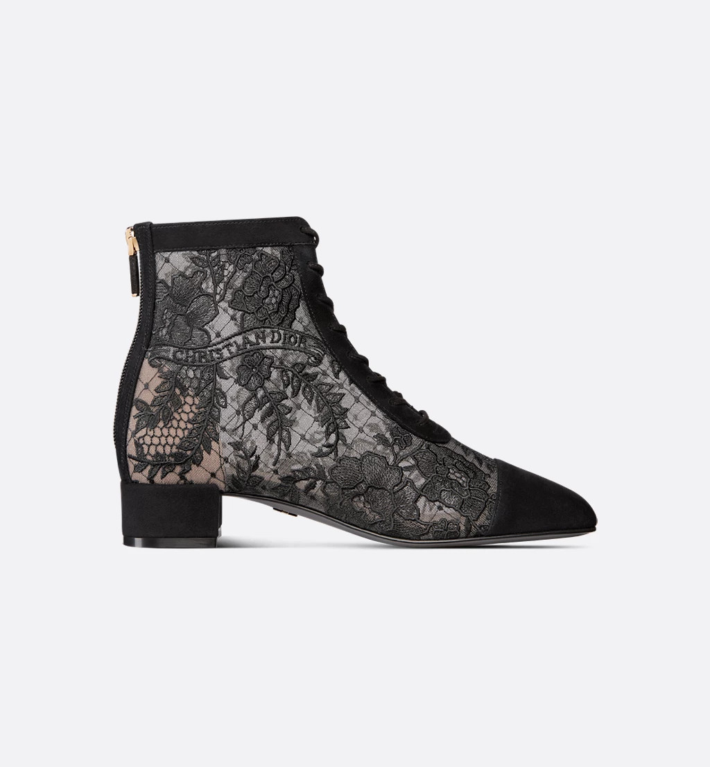 The Naughtily-D heeled ankle boot impresses with its elegant silhouette in the unique Andalusian style that runs through the entire collection. Crafted from mesh, the design boasts an elegant, transparent look, featuring all-over Dior Roses embroidery, the Christian Dior signature, and black goat suede details. The tongueless construction gives the shoe a unique, openwork look. A 3 cm block heel and lace-up closure complete this delicate creation.