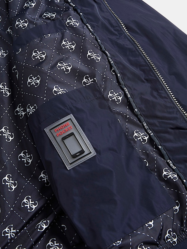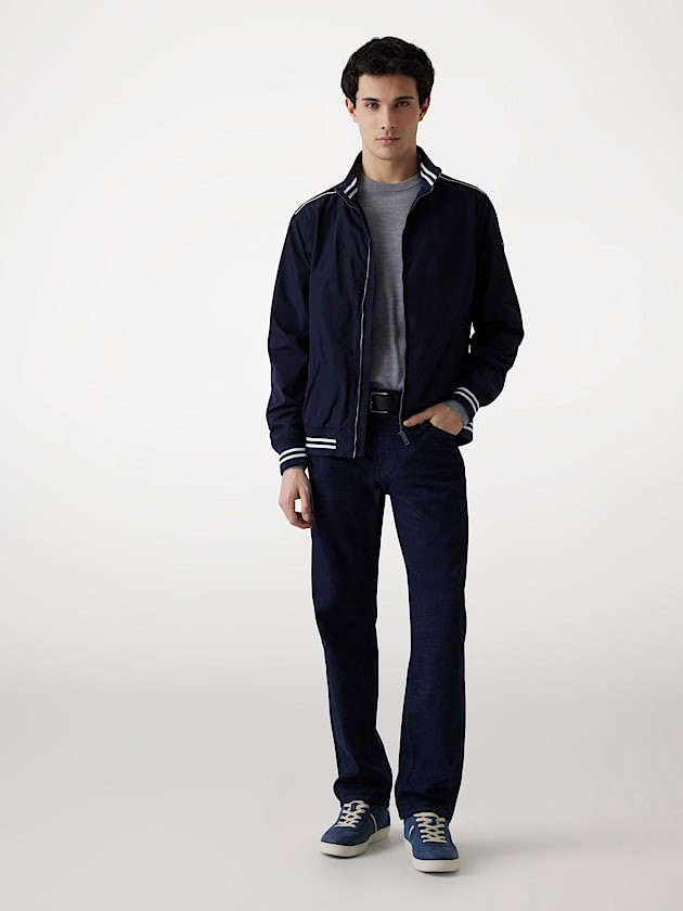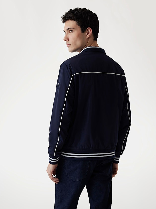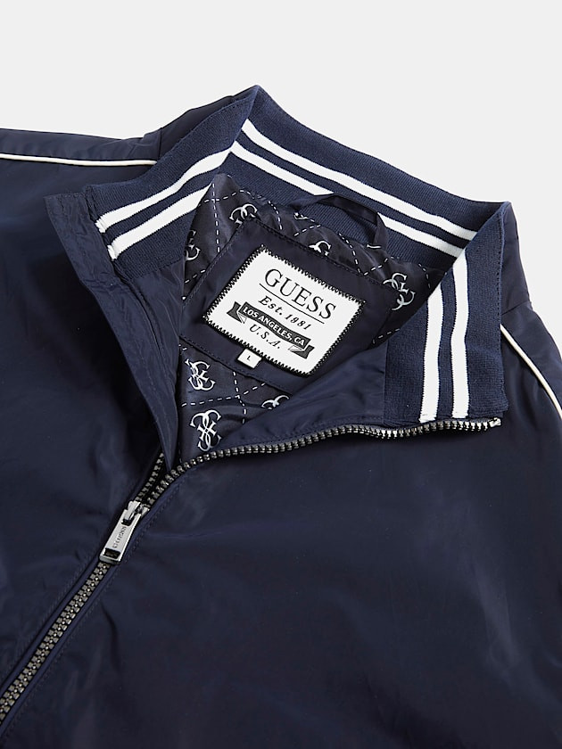 Features contrast trim on the shoulders, sleeves, and back yoke, as well as striped ribbing on cuffs, hem, and the inside of the stand-up collar.