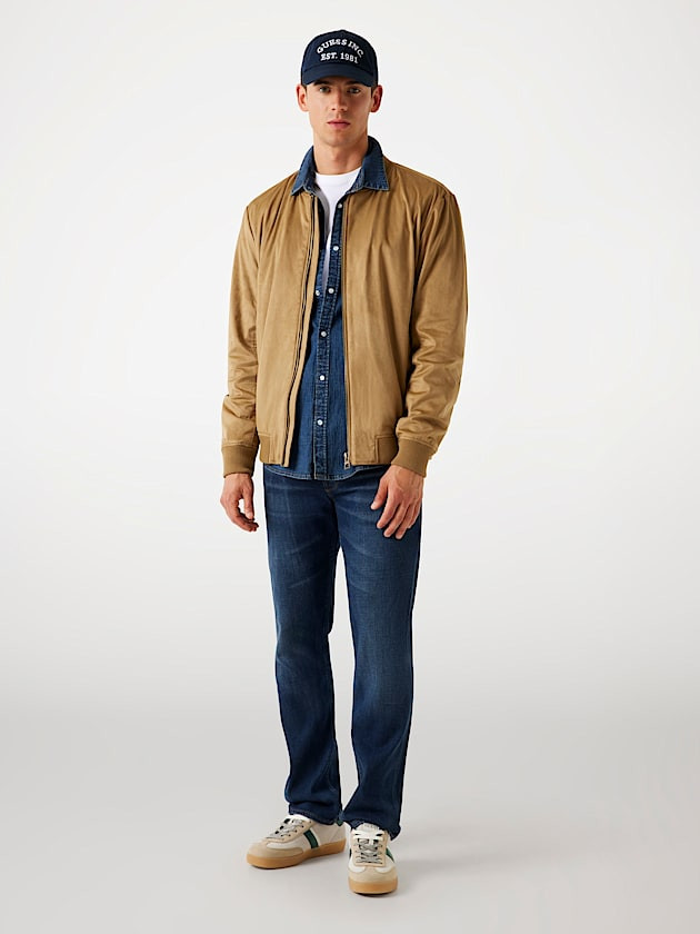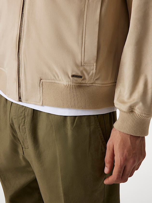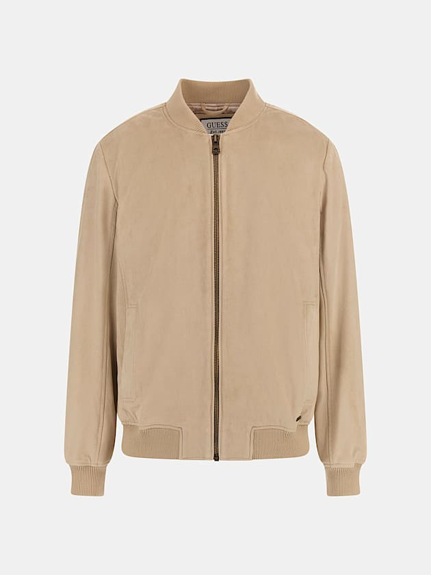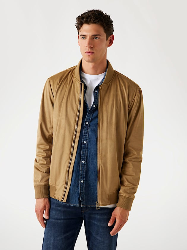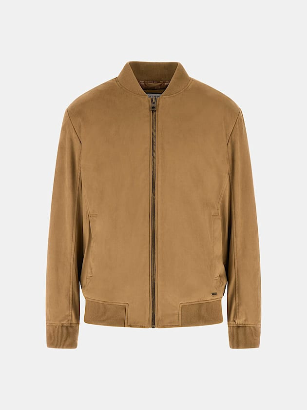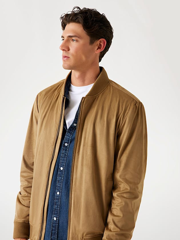Features ribbed knit cuffs, hem, and bomber-style collar.
