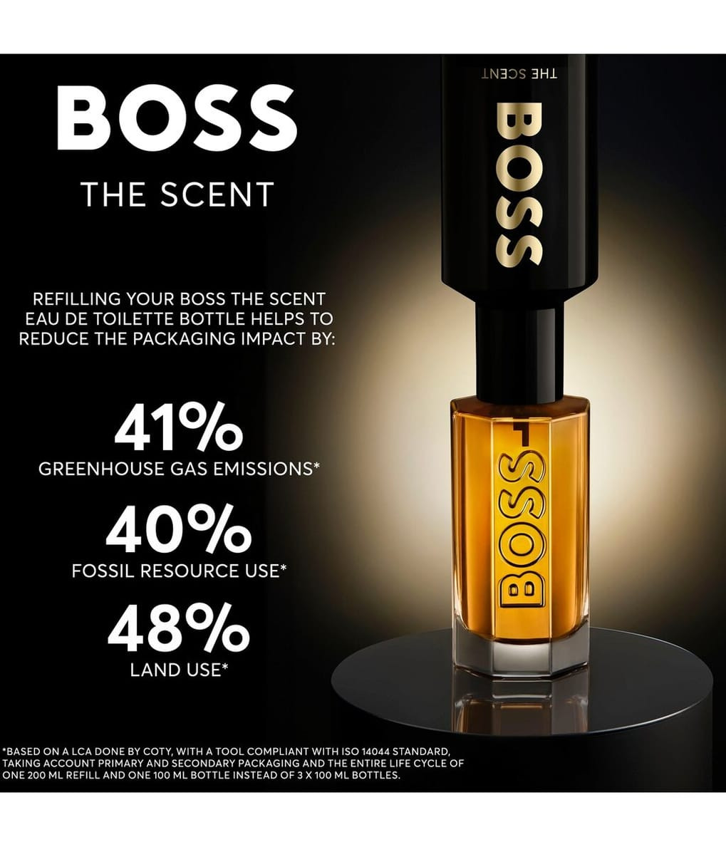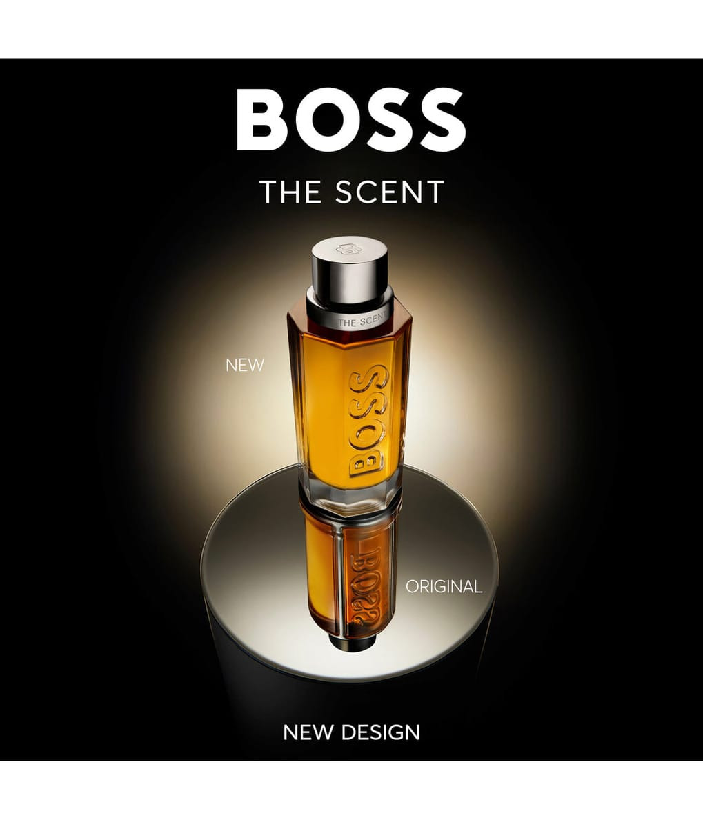 BOSS The Scent for Him is an iconic eau de toilette capturing the powerful, unmistakable chemistry of a power couple. This amber-woody-fruity fragrance opens with spicy freshness of natural ginger oil, blending with the sweet, addictive Maninka fruit exclusive to BOSS. The scent is deepened by warm, sensual leather accords, leaving a captivating embrace. Presented in a refillable bottle featuring the BOSS logo and double-B monogram, it symbolizes strength and attraction.